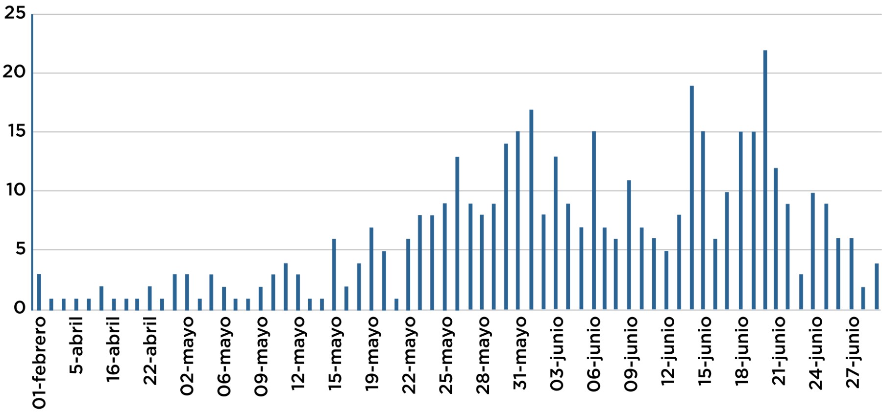 La distribución de casos confirmados por día de inicio de síntomas se muestra en la Figura 1. En la población pediátrica del estado de Guanajuato, el número de casos por día mostró poca variación hasta el 25 de mayo, donde el número de casos se incrementaron. Los picos más altos han sido en el mes de junio.