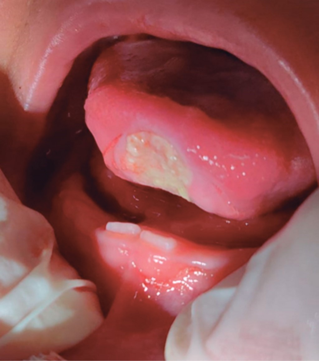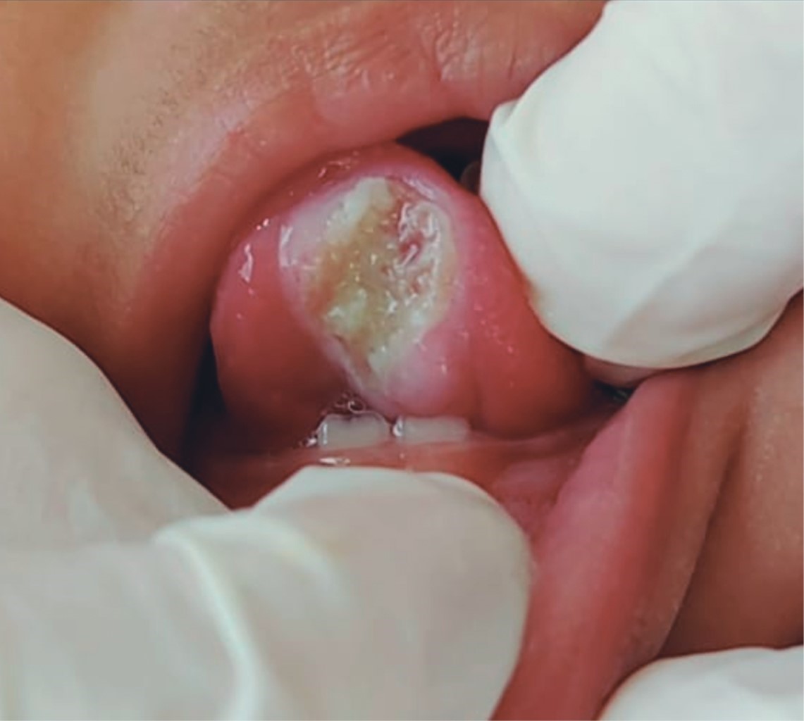 A la exploración extraoral se aprecian facie álgica, conducta irritable y un peso de 7 kilogramos, ubicándose por debajo del percentil 15 para la edad de acuerdo a las gráficas según la Organización Mundial de la Salud (OMS); a la intraoral se observa una lesión macular, exofítica ulcerativa, blanquecina y de bordes bien definidos, en la cara ventral de la lengua, de aproximadamente 20 mm de largo × 14 mm de ancho, dolorosa a la palpación y con presencia de sangrado al tacto. Se aprecia erupción de incisivos centrales inferiores, los cuales tienen un aspecto lacerante en borde incisal (Figura 1).