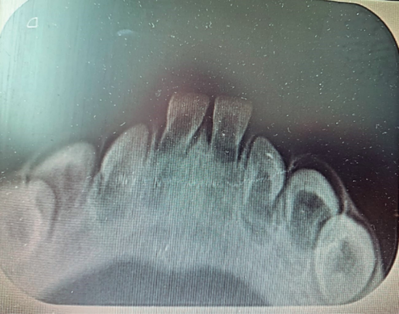 Se toma radiografía oclusal inferior, donde se confirma que dichos órganos dentarios presentes en la cavidad bucal pertenecen a la fórmula dentaria primaria (Figura 2).