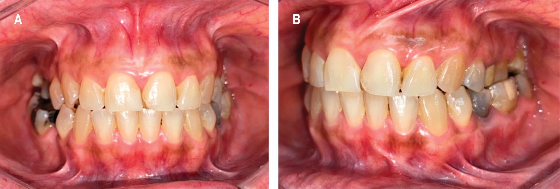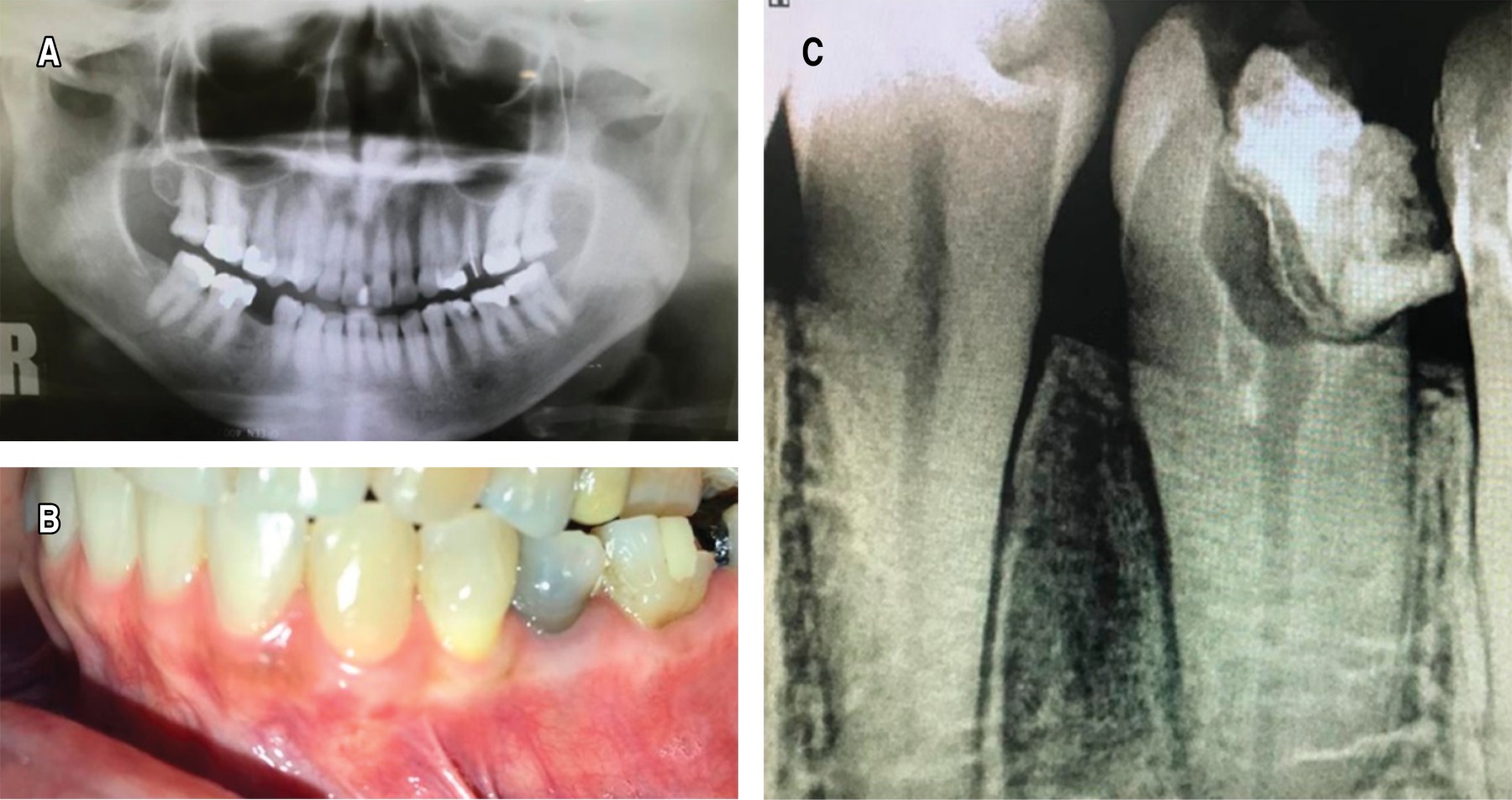 Al examen físico extrabucal se observan tercios faciales aparentemente simétricos, al examen intrabucal se evidencian múltiples restauraciones defectuosas, ausencia de órganos dentarios 1.8, 2.8, 3.8, 4.5 y 4.8. A nivel de 3.5 y 36 se observa restauración de tipo provisional. Se observa un aumento de volumen de 7.5 mm de altura × 3.5 mm de ancho, en zona mandibular premolar (entre 3.4 y 3.5) (Figura 1), normocrómico, normotérmico, firme a la palpación, se realizaron pruebas de sensibilidad dentaria en órganos dentarios 3.4-3.5-3.6, obteniendo resultados negativos para todas las pruebas realizadas (frío, calor, percusión vertical, percusión horizontal).