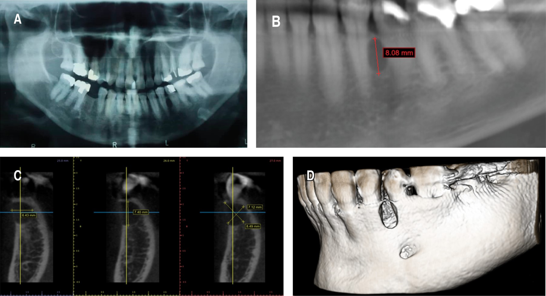 Al examen imagenológico se evaluó una radiografía panorámica dental sinusal, donde se observa una imagen radiolúcida de bordes definidos ubicado entre órganos dentarios 3.4 y 3.5, que abarca de la porción ósea crestal a tercio medio inferior radicular, sugerente a pérdida de estructura ósea. De igual forma se evaluó una tomografía de haz cónico mandibular, donde se observó imagen hipodensa en contraste con densidad de estructura ósea, de 8.08 mm de altura por 2.48 mm de ancho en su porción más cefálica y 4.03 mm de ancho en su zona más caudal × 6.43 mm de profundidad, se observa solución de continuidad de cortical vestibular, se observó cortical lingual sin alteraciones (Figura 2).