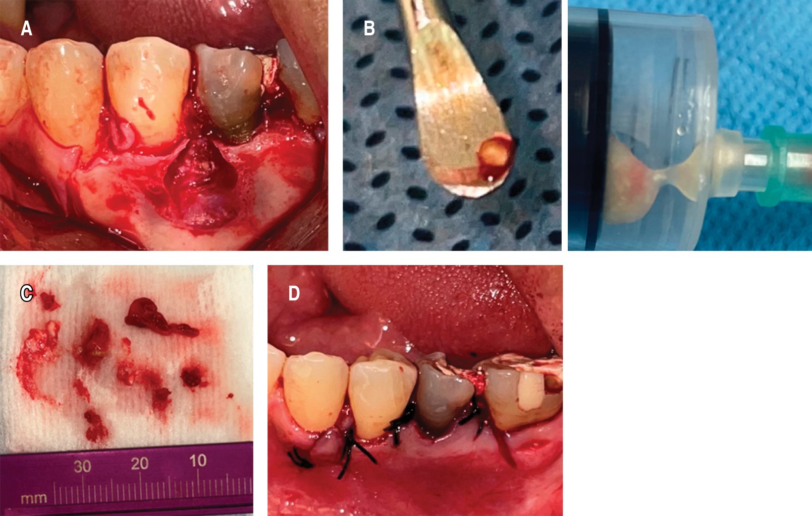 Se realizó biopsia escisional bajo anestesia local con lidocaína a 2%, punción de la zona, donde se obtiene un líquido de coloración ámbar con perlas de las mismas características crómicas, abordaje con incisión crevicular, levantamiento de colgajo mucoperióstico, exposición de la lesión, enucleación, curetaje, osteotomía periférica con márgenes de seguridad de 0.5 mm, abundante lavado con solución salina 0.9% y síntesis de tejidos. Se envió la muestra a patólogo bucal y maxilofacial para su estudio (Figura 3).