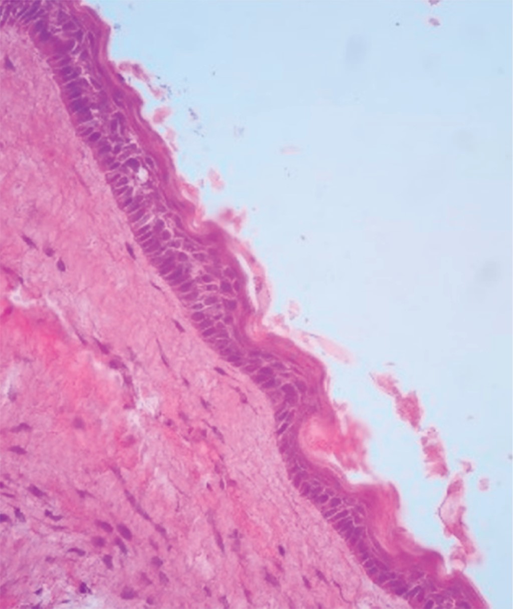 Al microscopio se observa quiste odontogénico delineado por epitelio plano estratificado paraqueratinizado. La superficie epitelial se observa corrugada y la basal se observa en empalizada. Pared de tejido conectivo fibroso. Focos discretos de inflamación crónica y áreas extensas de hemorragia reciente. Presencia de trabéculas óseas maduras de aspecto normal. No hay evidencia de malignidad en el tejido estudiado. Se obtuvo como diagnóstico histopatológico queratoquiste odontogénico (Figura 4).