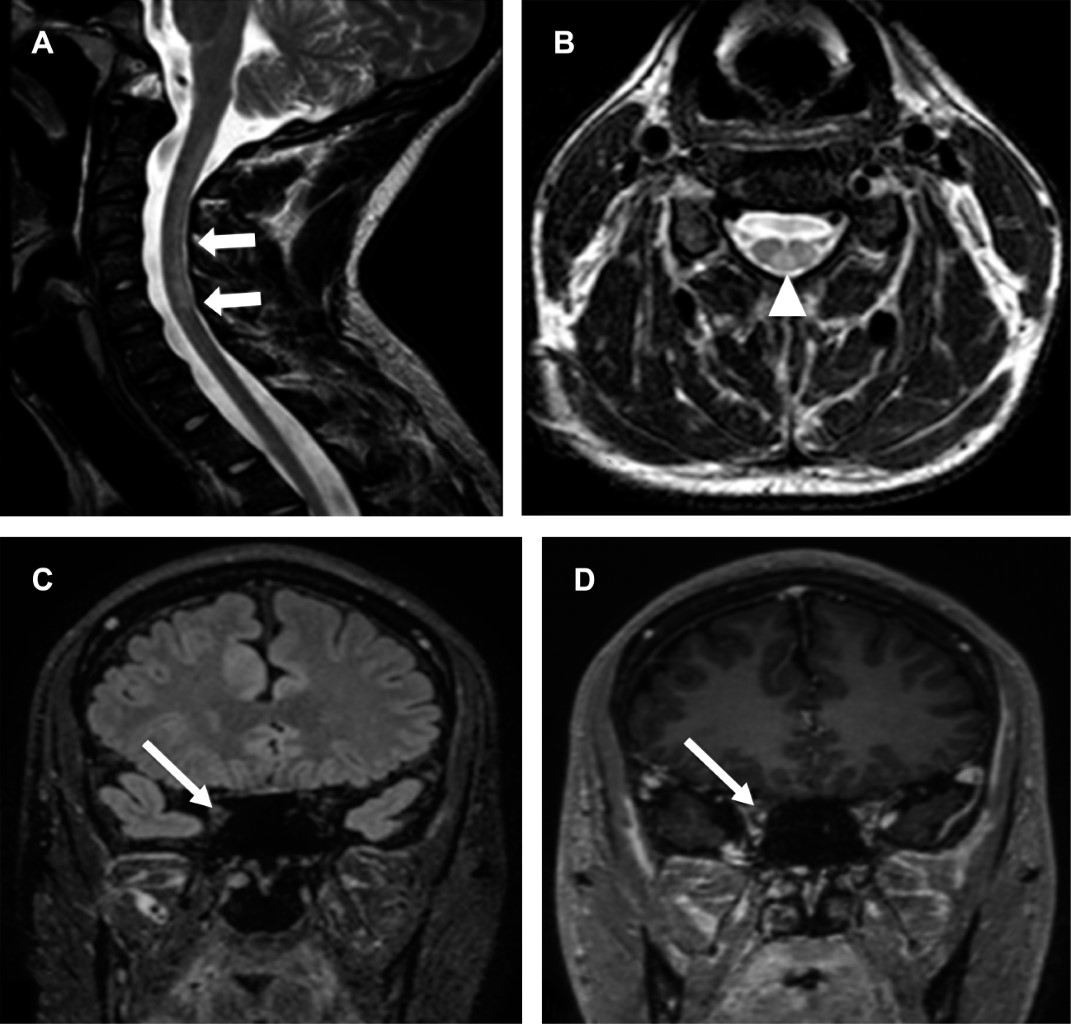 Masculino de 17 años con dos semanas de febrícula, cefalea, ataxia, disminución de agudeza visual de predominio derecho, temblor, fuerza disminuida en extremidades. Laboratoriales: leucocitos 10,100/mm3 con 75%N, proteína C reactiva (PCR) 41.2 mg/L, ELISA VIH negativo, tóxicos en orina negativos. Punción lumbar: leucocitos 70/μL (92% mononucleares), glucosa 68 mg/dL, sugerentes de EMDA, se realizó resonancia de ingreso (Figura 1); se descartó EM por negatividad de bandas oligoclonales IgG específicas, con positividad para anticuerpos anti-MOG mediante EBC. El tratamiento agudo se realizó con metilprednisolona intravenosa a dosis altas con discreta mejoría, en resonancia control presentó compromiso de médula espinal, así como de nervios ópticos (Figura 2); se adicionaron inmunoglobulinas, ocho meses después presentó mejoría sintomática. En resonancia de seguimiento para valoración de tratamiento con disminución de lesiones sin realce de las mismas (Figura 3).