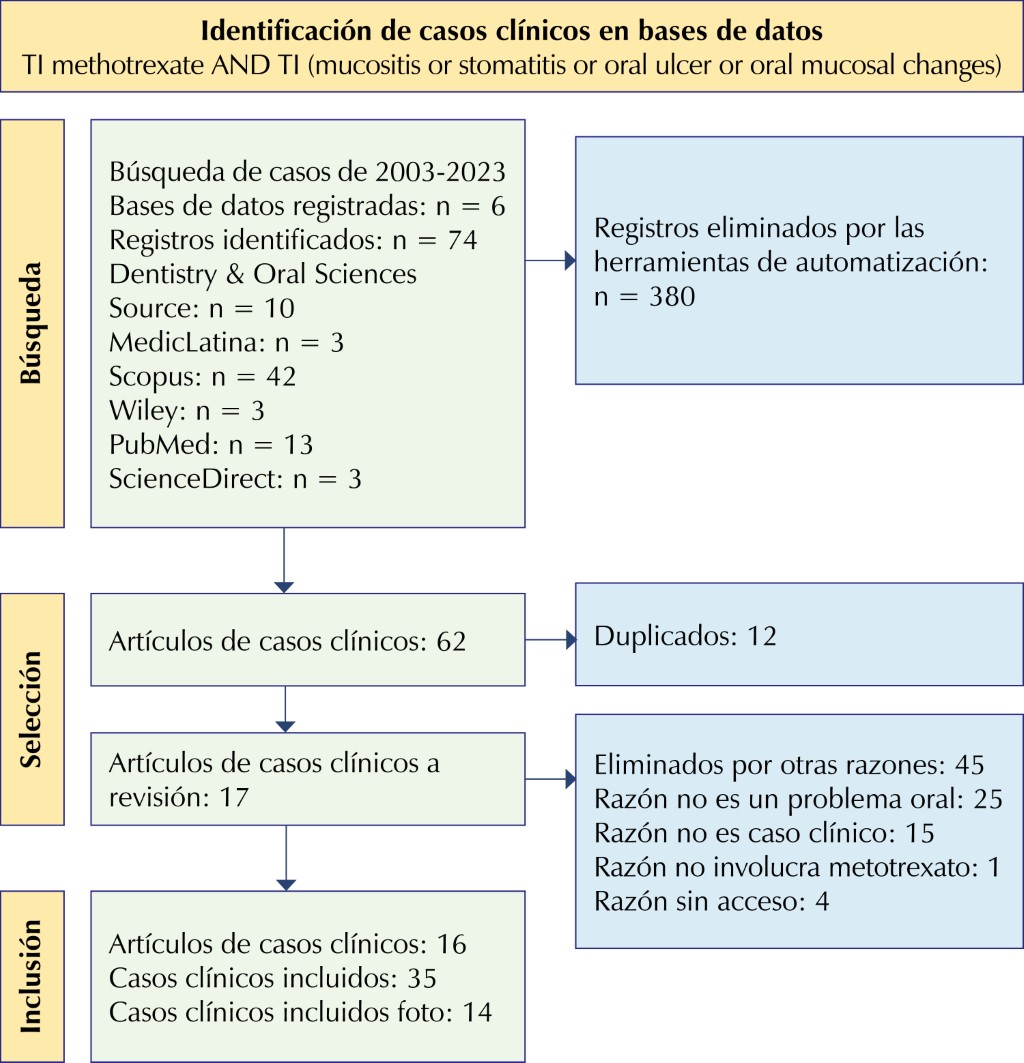 Para la búsqueda de casos se empleó la estrategia de búsqueda: TI (methotrexate) AND (Case Report) AND (Mucositis).