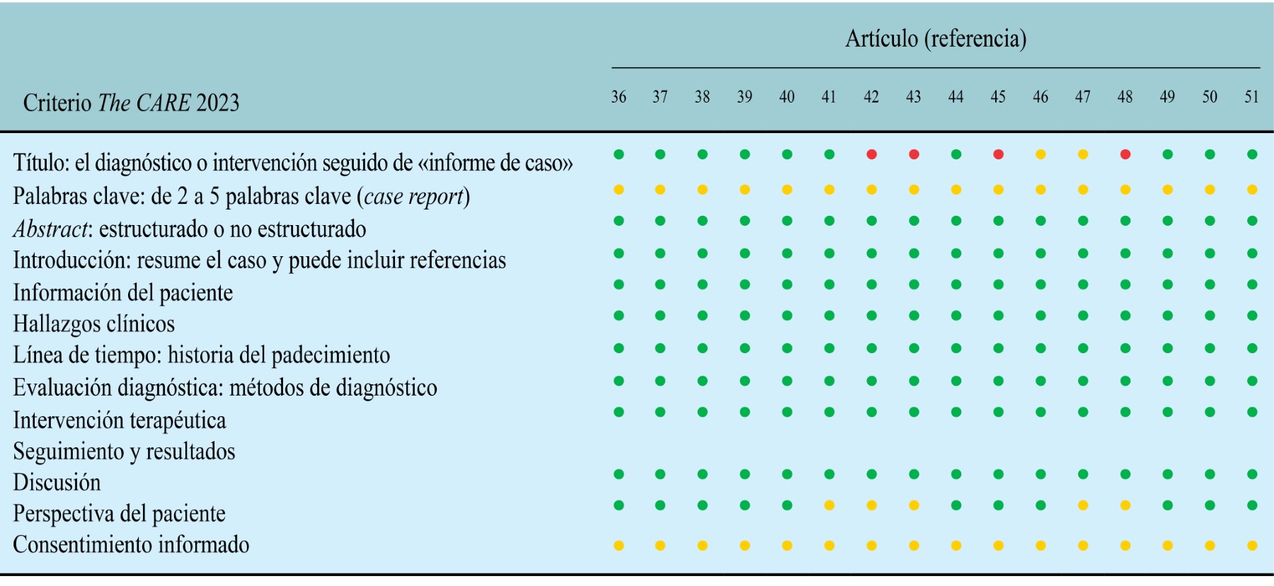 La calidad de los artículos se evaluó con los criterios CARE (CAse REports), una guía creada por un grupo internacional de expertos para respaldar un aumento en la precisión, transparencia y utilidad de los informes de casos.34,35