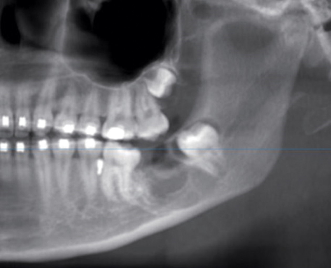 A la exploración se identificó aumento de volumen en cuerpo, ángulo y rama mandibular. En la cavidad oral se encontró expansión en las corticales óseas y en cambio se identificó la ausencia del segundo molar inferior izquierdo.