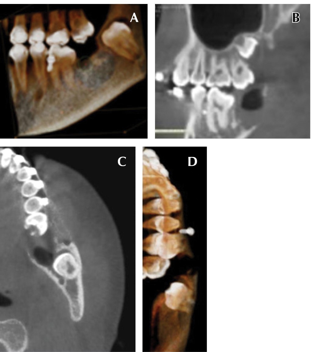La radiografía panorámica permitió observar un área radiolúcida unilocular que se extendía a partir del cuerpo mandibular (Figura 1), desde la zona distal del primer molar inferior izquierdo hasta la parte mesial del segundo molar incluido, involucrando el canal del nervio inferior. El segundo molar inferior estaba incluido en la lesión y desplazado posterosuperiormente, así como desplazamiento basal del conducto dentario inferior. En la tomografía axial computarizada con reconstrucción se apreció una masa isodensa en el cuerpo y rama mandibular izquierda, con expansión de corticales vestibular y lingual (Figura 2).