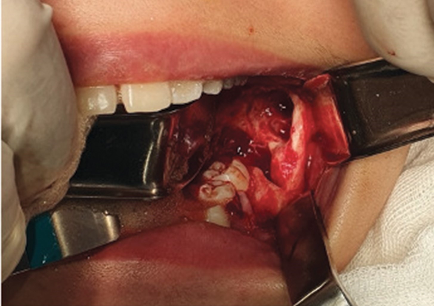 Bajo anestesia general y con intubación orotraqueal, se realizó la resección quirúrgica conservadora de la lesión, con curetaje en todo el lecho quirúrgico y odontectomía del segundo molar inferior izquierdo. No se observó comunicación al conducto dentario inferior ni perforación de las corticales óseas en el transoperatorio (Figura 3).