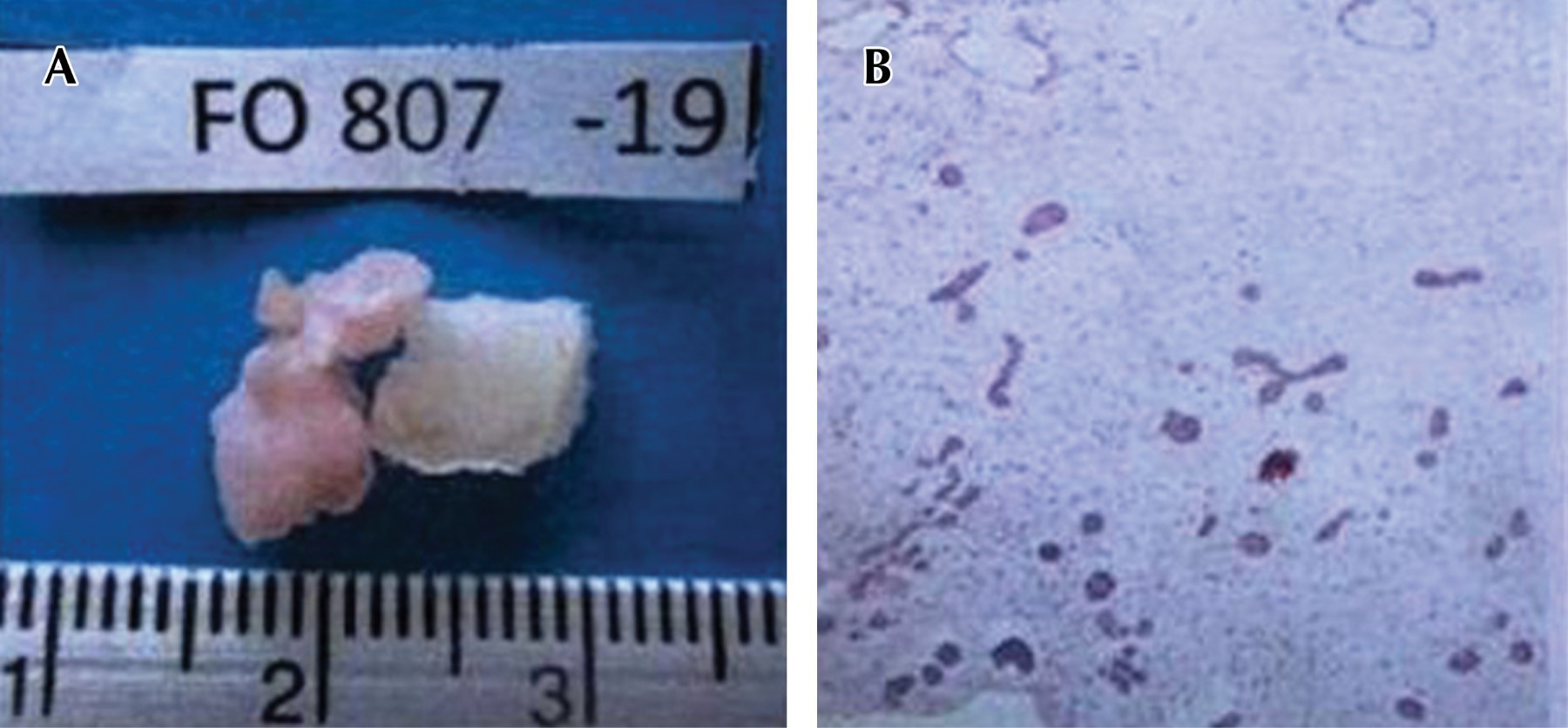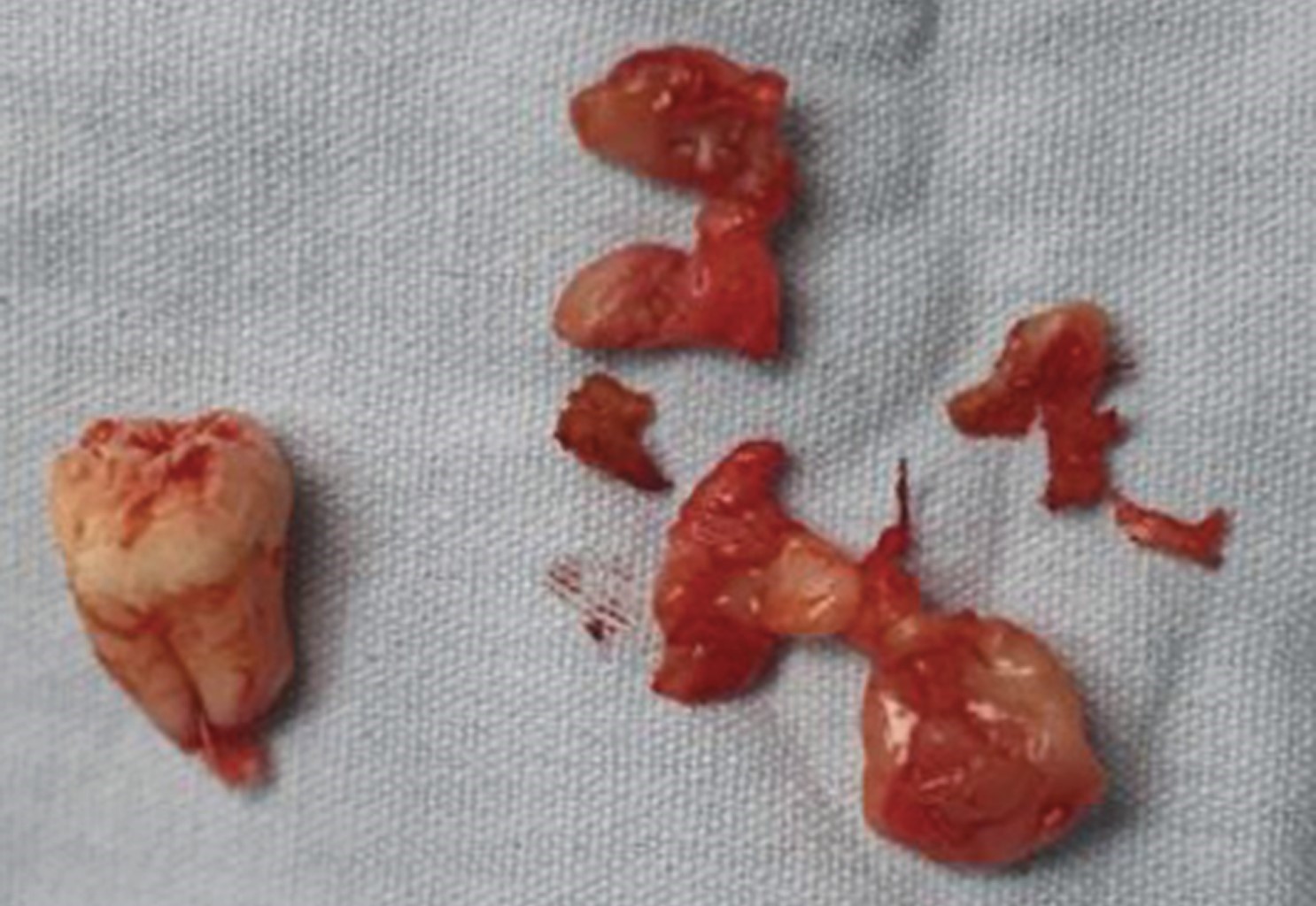Se obtuvo pieza quirúrgica consistente en tejido tumoral multifragmentado (Figura 4), del cual se realizó estudio histopatológico y del que se identificaron abundantes fibroblastos y epitelio odontogénico dispuesto en forma tubular, con células cuboideas y cilíndricas (Figura 5).