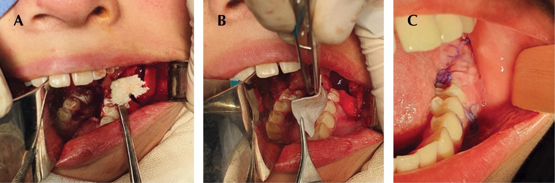 Se colocaron suturas en la periferia de la herida, simulando una marsupialización y se introdujo en el lecho quirúrgico injerto óseo y membrana para la correcta regeneración de tejidos y así obtener una mayor facilidad en la parte de rehabilitación con implante.