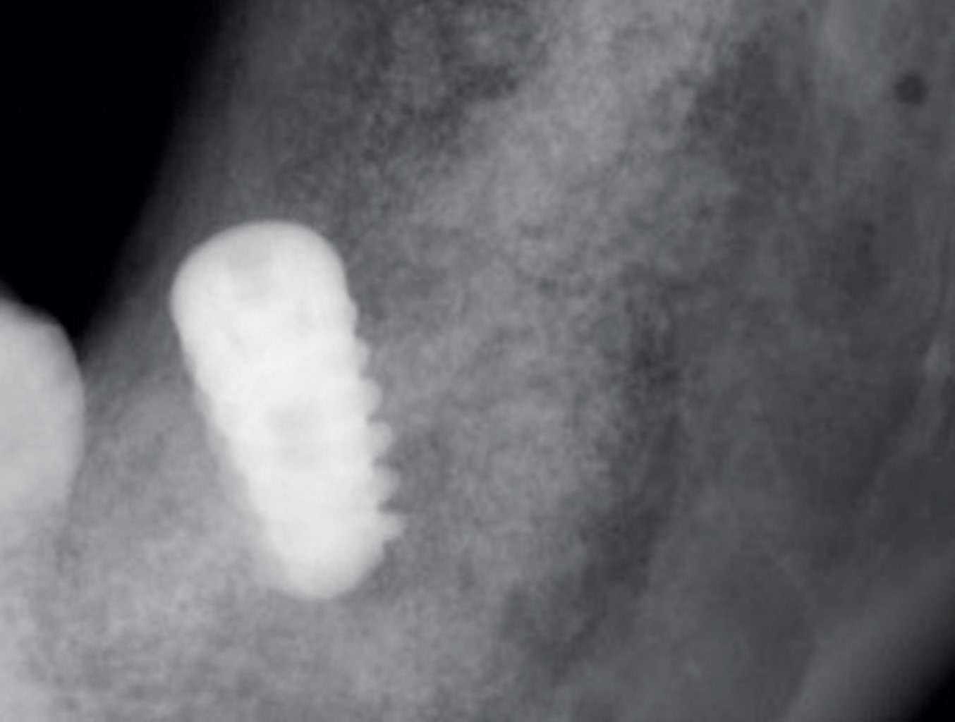 Posteriormente, se tuvo el seguimiento del paciente, identificando si la regeneración de tejidos era la adecuada para la colocación del implante dental. Finalmente, se observó la zona mandibular posterior en condiciones para su colocación, bajo anestesia local, adaptando un implante de titanio, permitiendo la osteointegración del mismo. Se llevó a cabo un control radiográfico tres y seis meses después para ver la evolución del implante, no se presentaron signos de recurrencia del tumor (Figura 6, 7, 8).