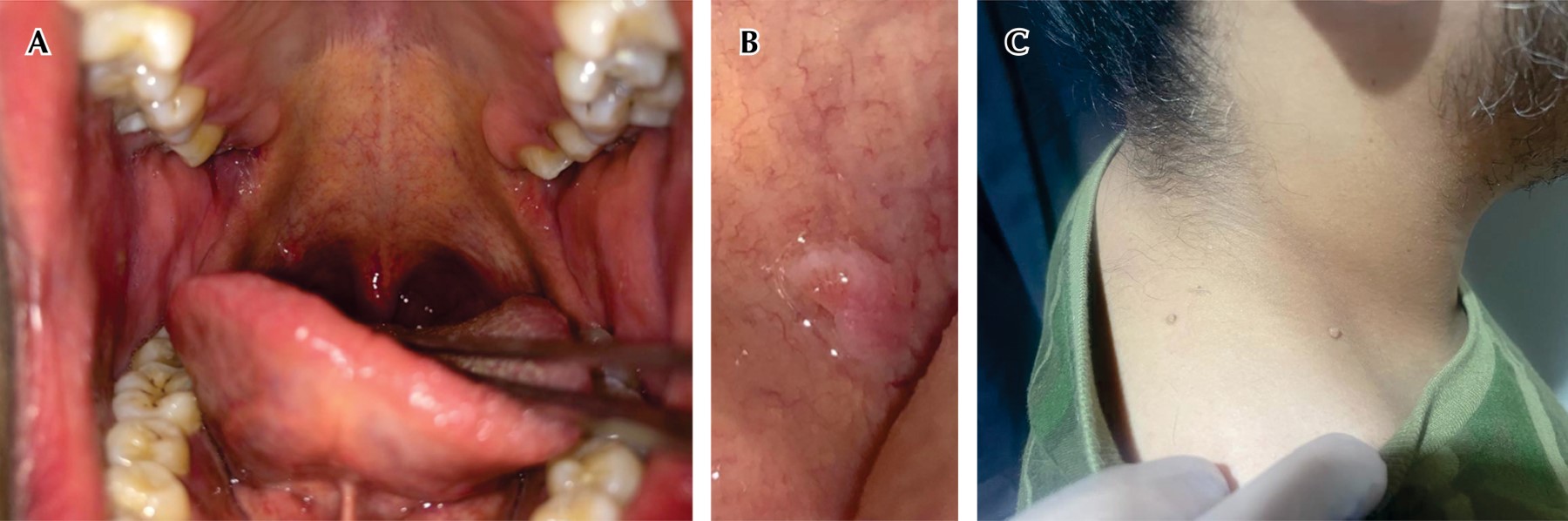 Se presenta paciente masculino de 36 años de edad, que refiere sangrado gingival y disminución en el volumen de la encía en diversos órganos dentales, razón por la cual acude a consulta periodontal. Durante la exploración física se observan crecimientos verrucosos y acantosis en el cuello. A nivel intraoral se evidencia recesiones gingivales en los órganos dentales 14, 15, 24 y 25, junto con gingivitis generalizada y caries múltiples. Además, en el paladar blando se identifica un crecimiento de base sésil, de 1 × 3 mm, que presenta cambios de coloración y es indoloro (Figura 1).