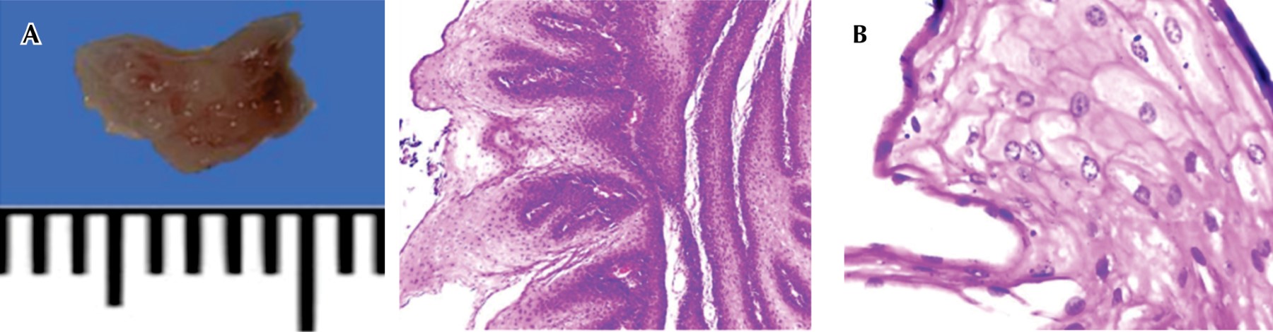 Se aprecian cambios morfológicos en las células del epitelio escamoso estratificado. Estos cambios incluyen acantosis, papilomatosis, hipergranulosis, hiperqueratosis y la presencia de células escamosas con halo perinuclear claro y binucleación poco comunes. Las lesiones son exofíticas y presentan tallos fibrovasculares. Están recubiertas por un epitelio escamoso estratificado no queratinizado y suelen mostrar infiltrado inflamatorio, se aprecian también células coilocíticas que son consideradas como la huella digital del VPH. También se puede asociar con cambios celulares notables que incluyen la formación de vacuolas perinucleares, núcleos agrandados, irregulares e hipercromáticos, así como binucleaciones. Estos cambios se conocen como coilocitos. Estos hallazgos son consistentes con las alteraciones observadas en la histopatología de las lesiones causadas por VPH.14-16