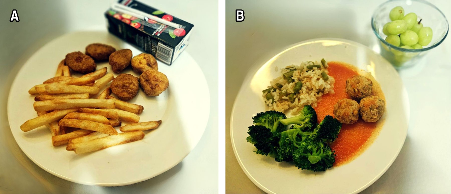 A fin de ejemplificar cómo la medicina culinaria puede ayudar a preparar alimentos saludables, los autores de este artículo comparan dos comidas. En la Figura 1A se muestra un plato con nuggets de pollo, papas fritas y un jugo de manzana; los cuales son alimentos sencillos de preparar y suele ser muy apetecible para los niños, pero tiene alto contenido de grasas saturadas, exceso de sodio, proteína de mala calidad, sin ofrecer verduras. Con el jugo se incluyen frutas, pero no fibra.