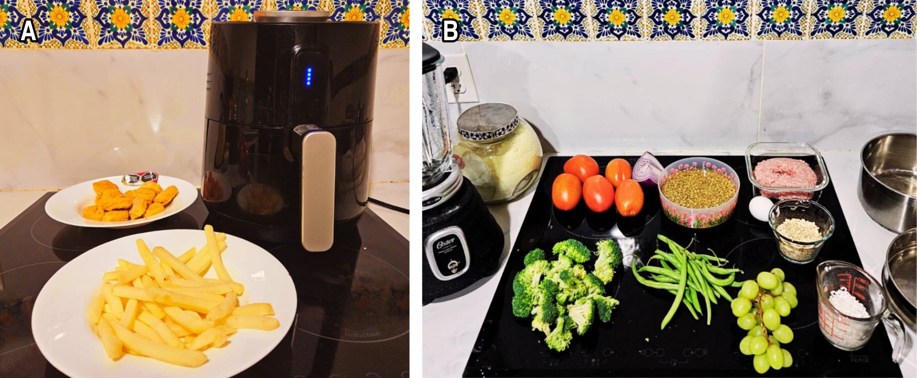 Al comparar los ingredientes que se requieren para la preparación de los platillos antes mencionados (Figura 2), cuando utilizamos alimentos procesados, sólo se requiere el cocinarlos en la freidora de aire, o freírlos en un sartén; sin embargo, no es una alimentación variada ni proporcional. Mientras que, en el platillo de albóndigas, se utilizaron diferentes alimentos con una cantidad importante de verduras, leguminosas y una cucharada de aceite de oliva. Con este platillo cumplimos con los principios de que la alimentación debe ser variada, suficiente, proporcionada y sin consumo de alimentos ultraprocesados. Sin embargo, el tiempo que se invierte en la preparación de los alimentos fue mayor con la alimentación saludable (90 minutos vs 30 minutos).