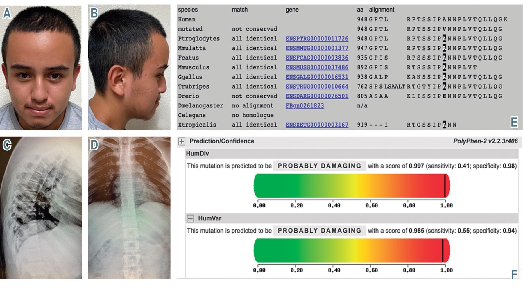 Dadas las manifestaciones clínicas del paciente se solicitó un panel genético, en el cual se reporta (Figura 1E y 1F) una variante de significado incierto en el gen ASXL2, c.2843C>T (p.Ala948Val). Se realizó estudio de extensión familiar, sin encontrar en sus padres dicho cambio.