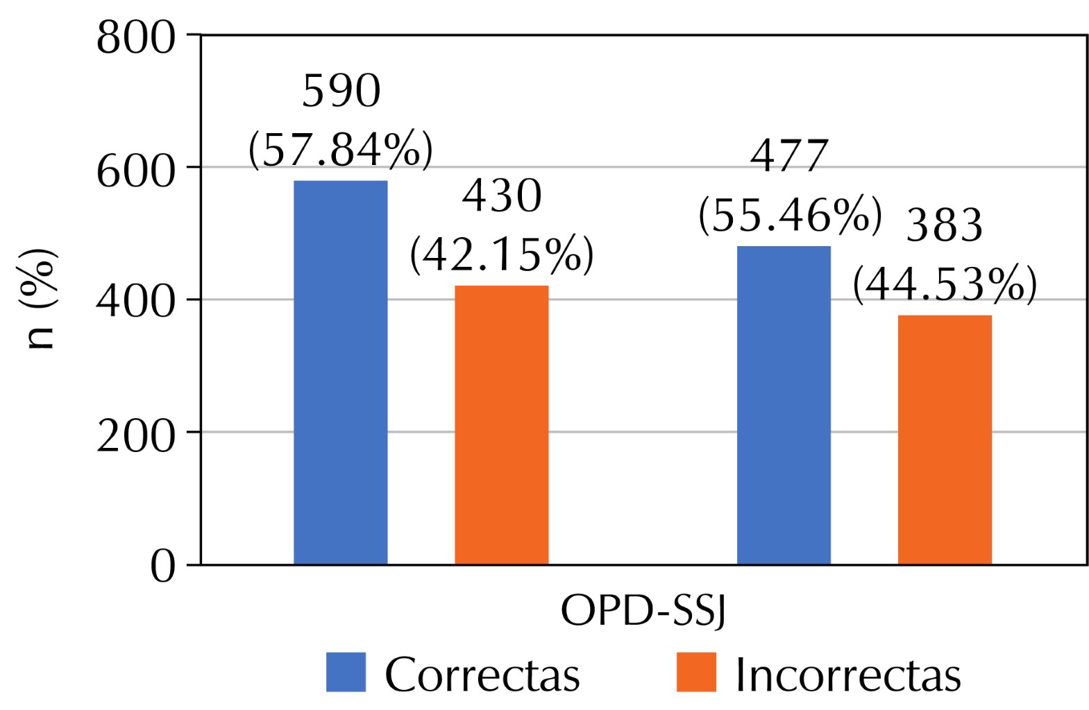 En respuestas incorrectas de ambas instituciones, una frecuencia de 813 (43.24%), del AHCGFAA corresponden 430 (42.15%) y del OPD-SSJ corresponden 383 (44.53%) (Figuras 1 y 2).