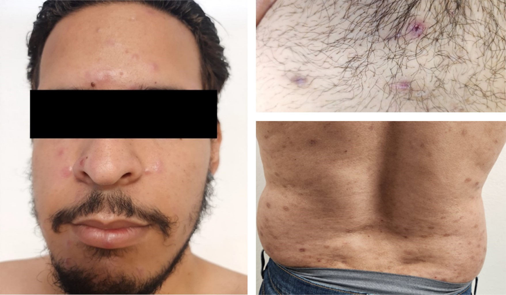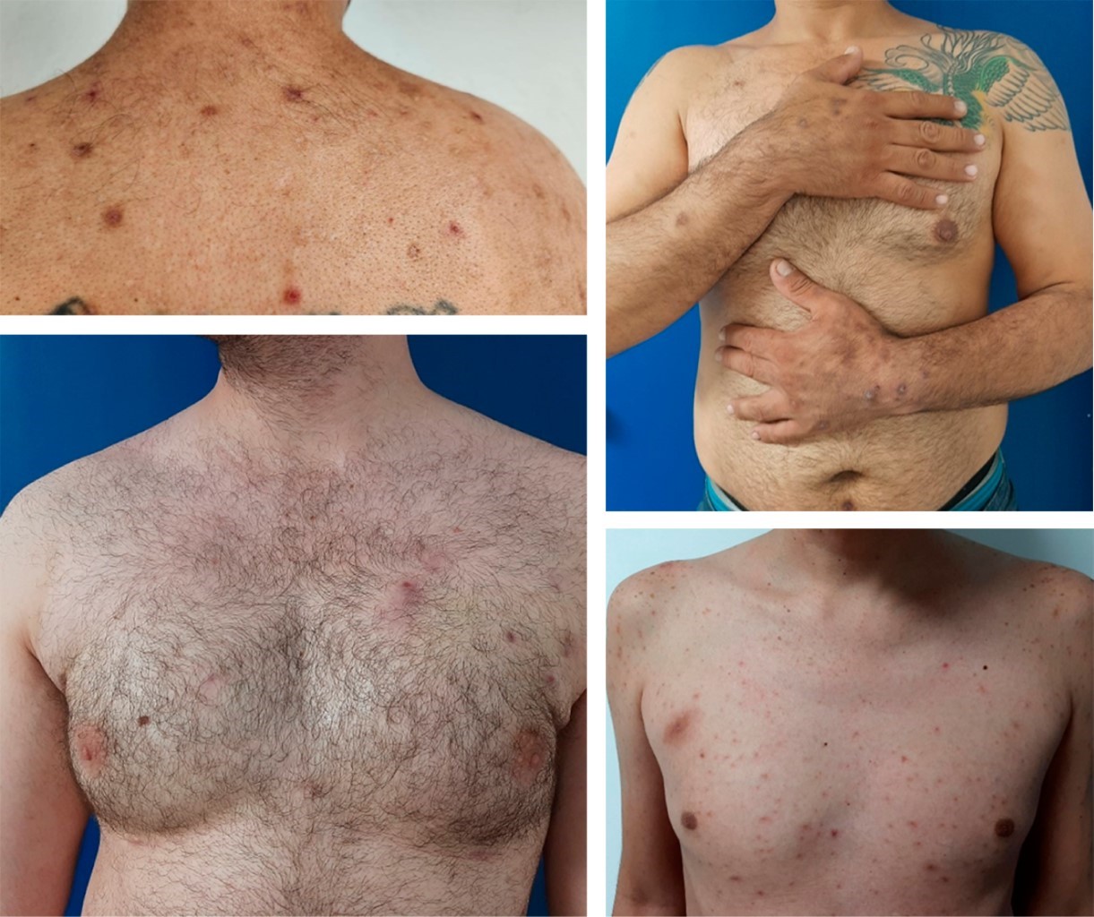 La manifestación clínica en todos los casos correspondió a dermatosis generalizada constituida por nódulos y/o pápulas eritematosas, en ocasiones pruriginosas y excoriadas, y que también llegaron a afectar palmas y plantas (Figuras 1, 2 y 3). De los pacientes con VIH, el conteo de células CD4+ al momento de la presentación fue en promedio de 211 (27-504), 50% de estos pacientes presentaron otro comórbido al momento del diagnóstico, dos pacientes con sífilis concurrente, uno con sarcoma de Kaposi y un último con tuberculosis pulmonar.
