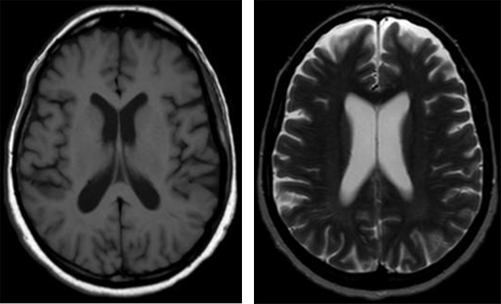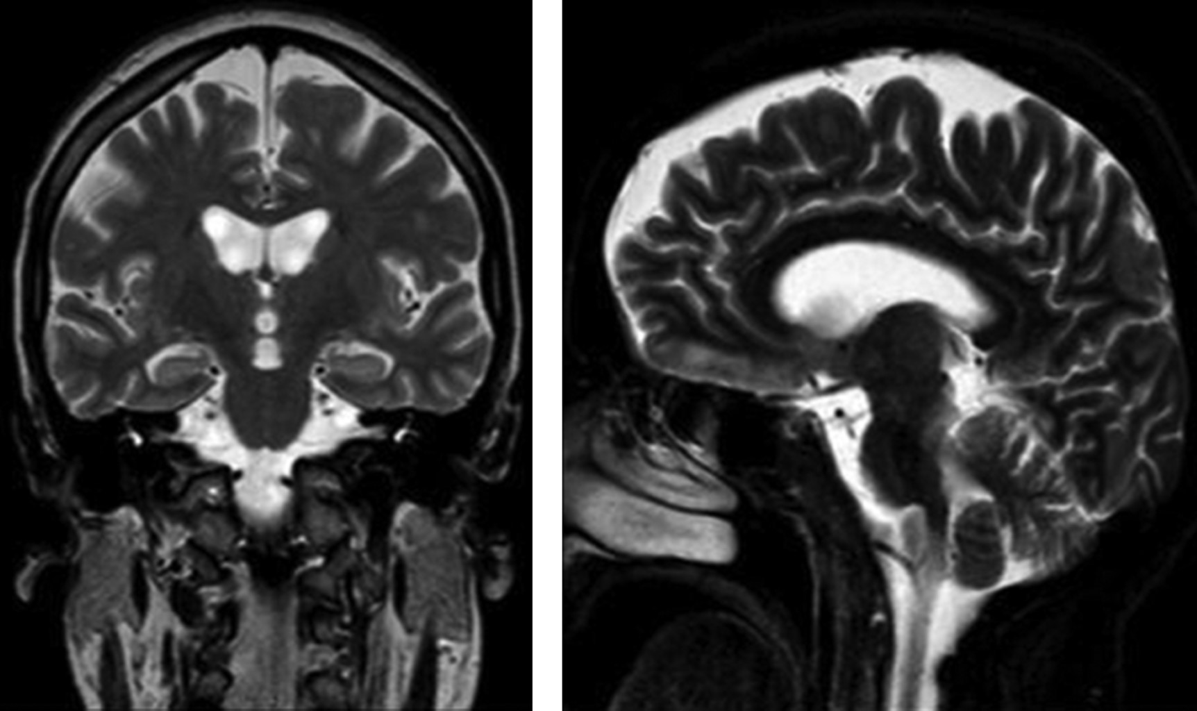 b) Evolución intrahospitalaria. Durante su estancia intrahospitalaria en psiquiatría continúa con la misma sintomatología, con desorientación en autopsíquica y alopsíquica (en función de tiempo y espacio), irritabilidad, agresividad, capacidad de concentración disminuida, funciones mentales no valorables, lenguaje incoherente, incongruente, ideas delirantes de daño y referencia, alucinaciones visuales, juicio desviado, pobre control de impulsos e intolerancia a la frustración. A la exploración neurológica se evidencia temblor intencional, disartria, ataxia cerebelosa, disdiadococinesia, apraxia ideomotora y del vestido, leve disminución de la fuerza en extremidades inferiores con alteraciones para la marcha. Exploración de pares craneales, reflejos osteotendinosos y función sensorial se encuentran sin alteraciones. El día 28 de septiembre del 2019 se reportaron niveles séricos de litio con 0.15 mEq/l. Se toma resonancia magnética con reporte del 15 de octubre, en el que se informa pérdida de volumen hacia la porción rostral de los lóbulos frontales y temporales de manera bilateral, sugestiva de atrofia cortico subcortical en esta región anatómica (Figuras 1 y 2). Posteriormente, el 18 de octubre se realiza electroencefalograma con resultado anormal, con signos de moderada alteración funcional cortico subcortical difusa con discreto predominio anterior bilateral.