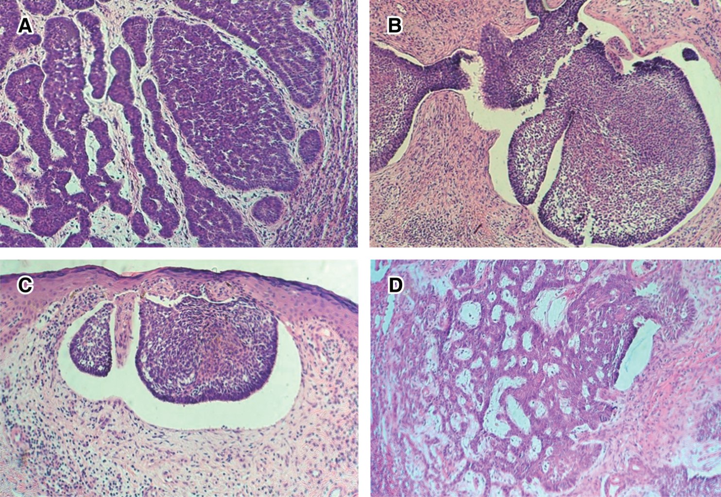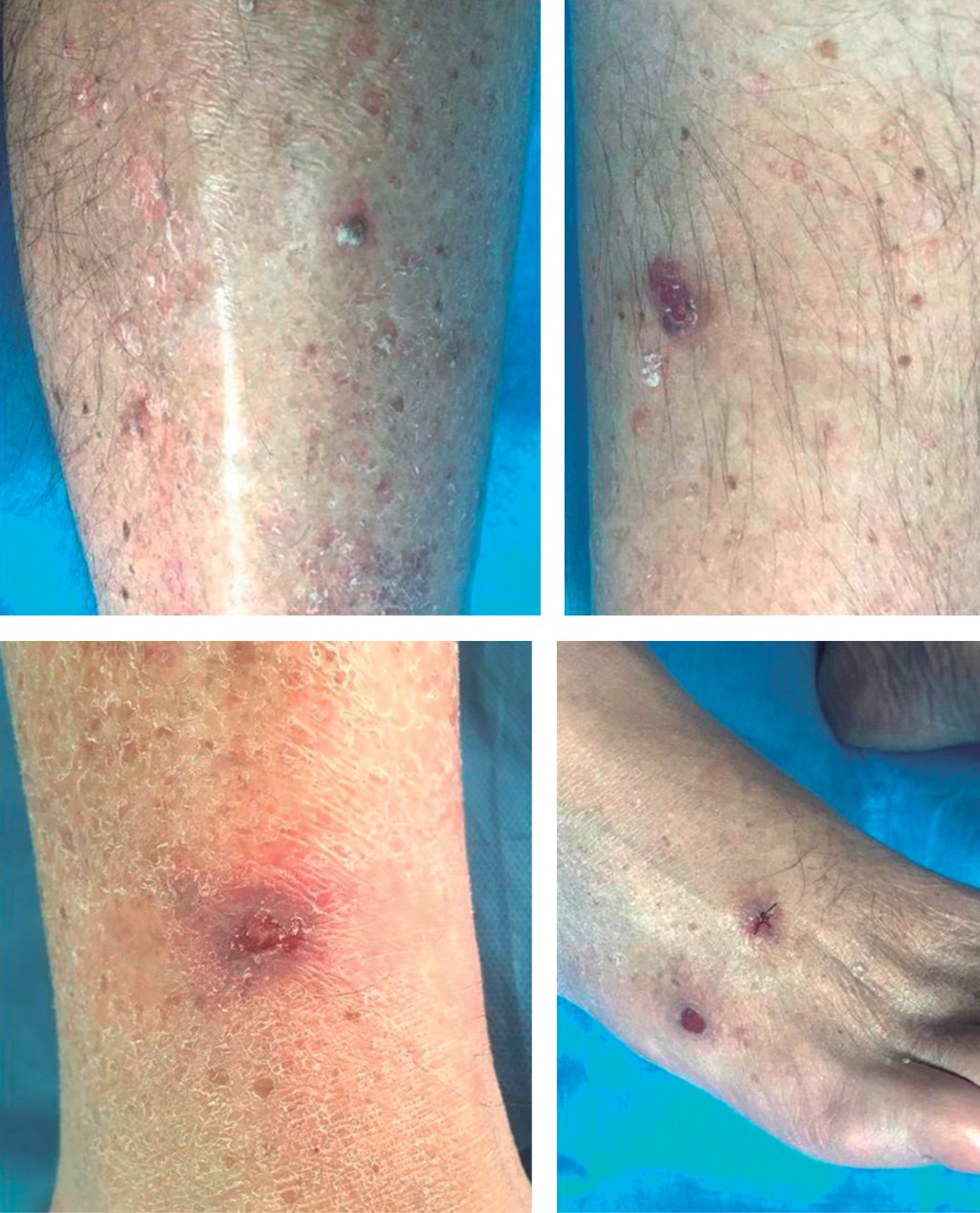 Hombre de 57 años de edad, quien acude por presentar una úlcera de 1.0 cm de diámetro en la cara dorsal de pie derecho, asintomática. Refiere evolución de ocho meses, manejada con antibióticos tópicos, sin mejoría. Entre sus antecedentes personales patológicos refiere cursar con hipertensión arterial sistémica de ocho años de evolución, en tratamiento con telmisartán 40 mg y amlodipino 5 mg. Portador de acromegalia secundaria a adenoma hipofisiario tratado con pegvisomant. En otros antecedentes destacan el tabaquismo crónico y la exposición solar prolongada atribuida a actividades de jardinería. A la exploración física se observan seis placas de aspecto eritemato-escamoso en ambas piernas y dorso de pie derecho. Las lesiones miden algunos milímetros de diámetro; de bordes bien delimitados, la mayor está ulcerada y cubierta por una costra sanguínea (Figura 1). El diagnóstico clínico presuntivo fue de psoriasis en gotas. Se tomó biopsia de una lesión. La pieza se fijó en formol al 10% y los cortes se procesaron con la técnica de H&E. Las imágenes muestran epidermis atrófica. La dermis subyacente está ocupada por cordones tumorales de células basaloides que forman una empalizada periférica; algunos de ellos adoptan un patrón glandular. El diagnóstico histopatológico fue de CBC sólido-adenoide. Luego de esto, se decidió la extirpación de las lesiones restantes. El diagnóstico del resto de las lesiones es el mismo. Tres son de variedad sólido, uno superficial y otro sólido-adenoide (Figura 2). A la fecha de este manuscrito, el paciente no ha desarrollado nuevas lesiones y mantiene manejo con protector solar, previa explicación de su padecimiento.