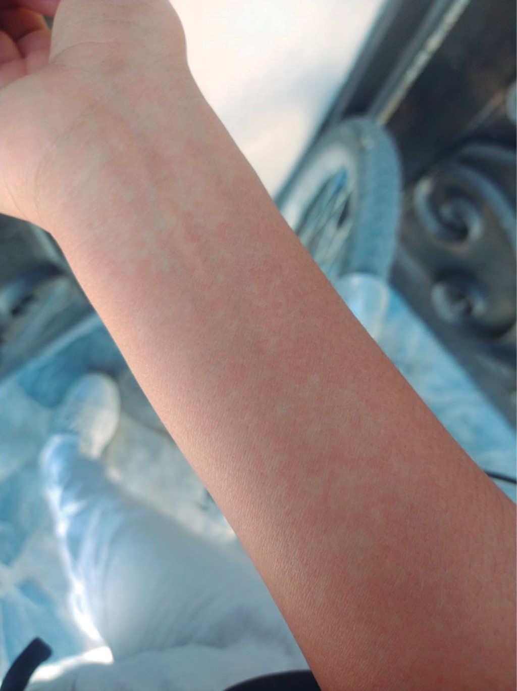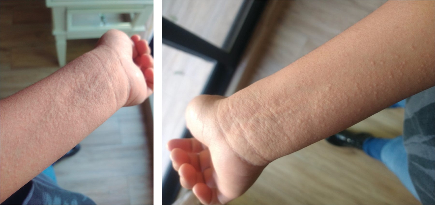 Como antecedente personal patológico de importancia, cursa con asma, en tratamiento con montelukast. Refiere que desde los 9-10 años sufre de episodios de ronchas desencadenados por la actividad física leve (desde caminatas de dos cuadras), acompañadas de palpitaciones, prurito generalizado y eritema (Figura 1), aparición de "sarpullido" (Figura 2), seguido de aumento de la temperatura en forma generalizada, con posterior desarrollo de frío y mareo y, en dos ocasiones, síncope.