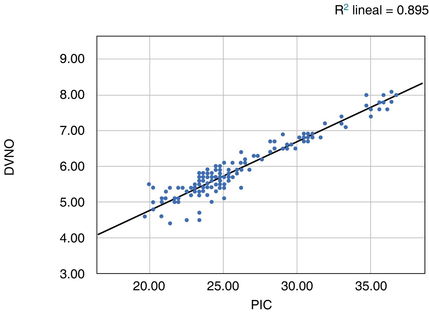Se realizó una correlación por el método estándar, entre DVNOG versus PIC (Figura 1), con un gráfico de dispersión, donde se obtuvo R2 = 0.89, p = 0.0001, siendo una correlación fuerte.