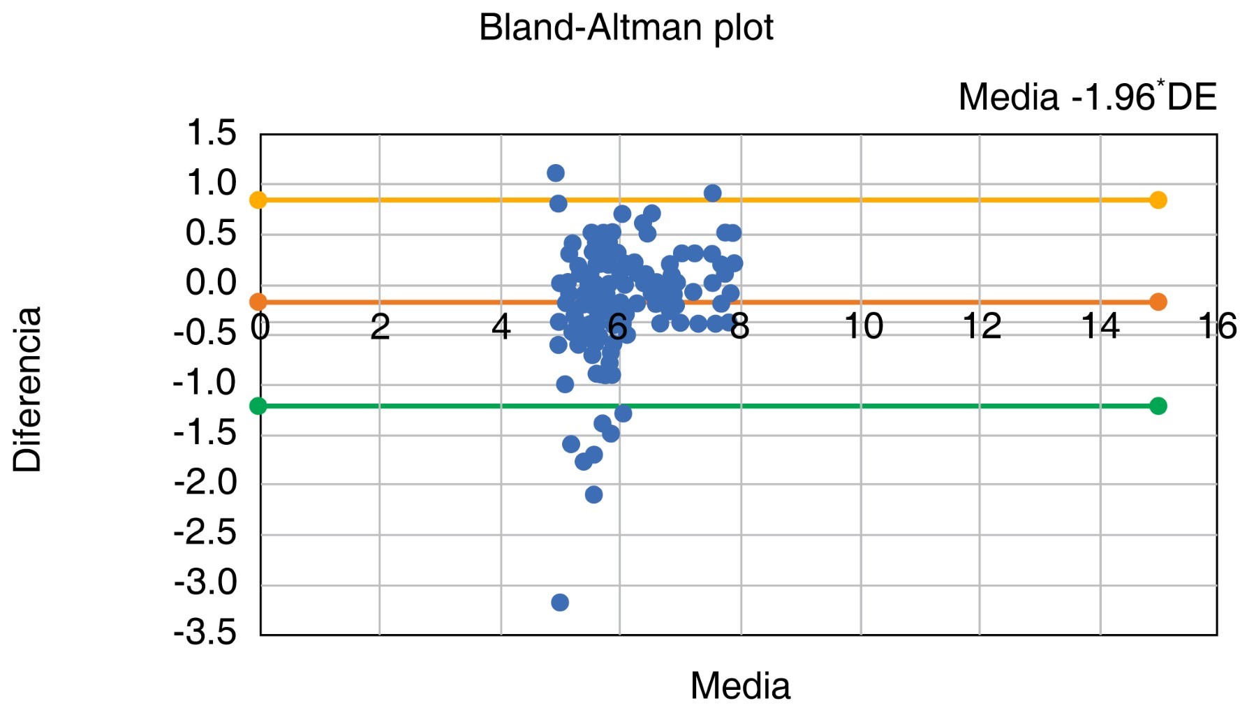 Para finalizar, se graficó un Bland-Altman plot para comparar el método a prueba (DVNOG) con el estándar de referencia con el sensor intraparenquimatoso (PIC), obteniendo un Bias (diferencia de medias) -0.188 ± -0.53, límite inferior -1.231, límite superior 0.8537, continuando con una correlación fuerte (Figura 2).