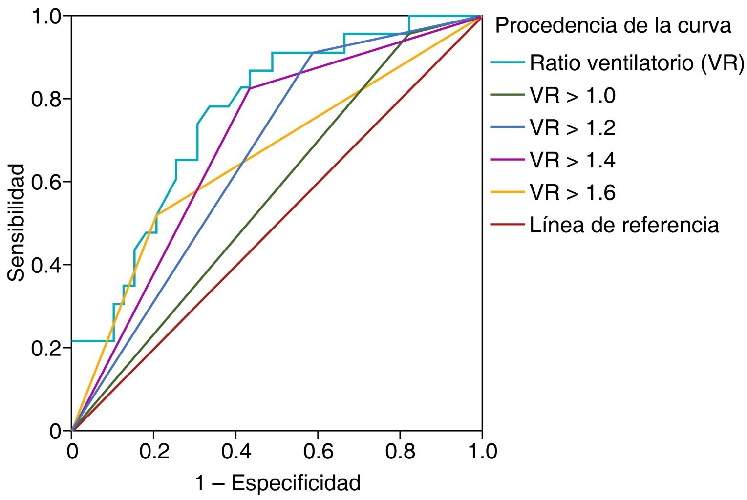 Análisis de capacidad diagnóstica del ratio ventilatorio. Se realizó un análisis de curva ROC y área bajo la curva para determinar el mejor rendimiento predictivo del ratio ventilatorio para el fracaso al retiro de la VMI y mortalidad. Se establecieron los puntos de corte de 1, 1.2, 1.4 1.6 y se calculó la sensibilidad, especificidad, valor predictivo positivo y valor predictivo negativo correspondientes. Asimismo, se estimó el coeficiente de regresión para cada punto de corte a través de modelos de regresión logística. Para todas las estimaciones se determinó el intervalo de confianza al 95% (IC95%) y se consideró un valor p < 0.05 como estadísticamente significativo.