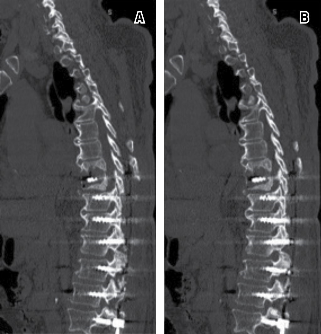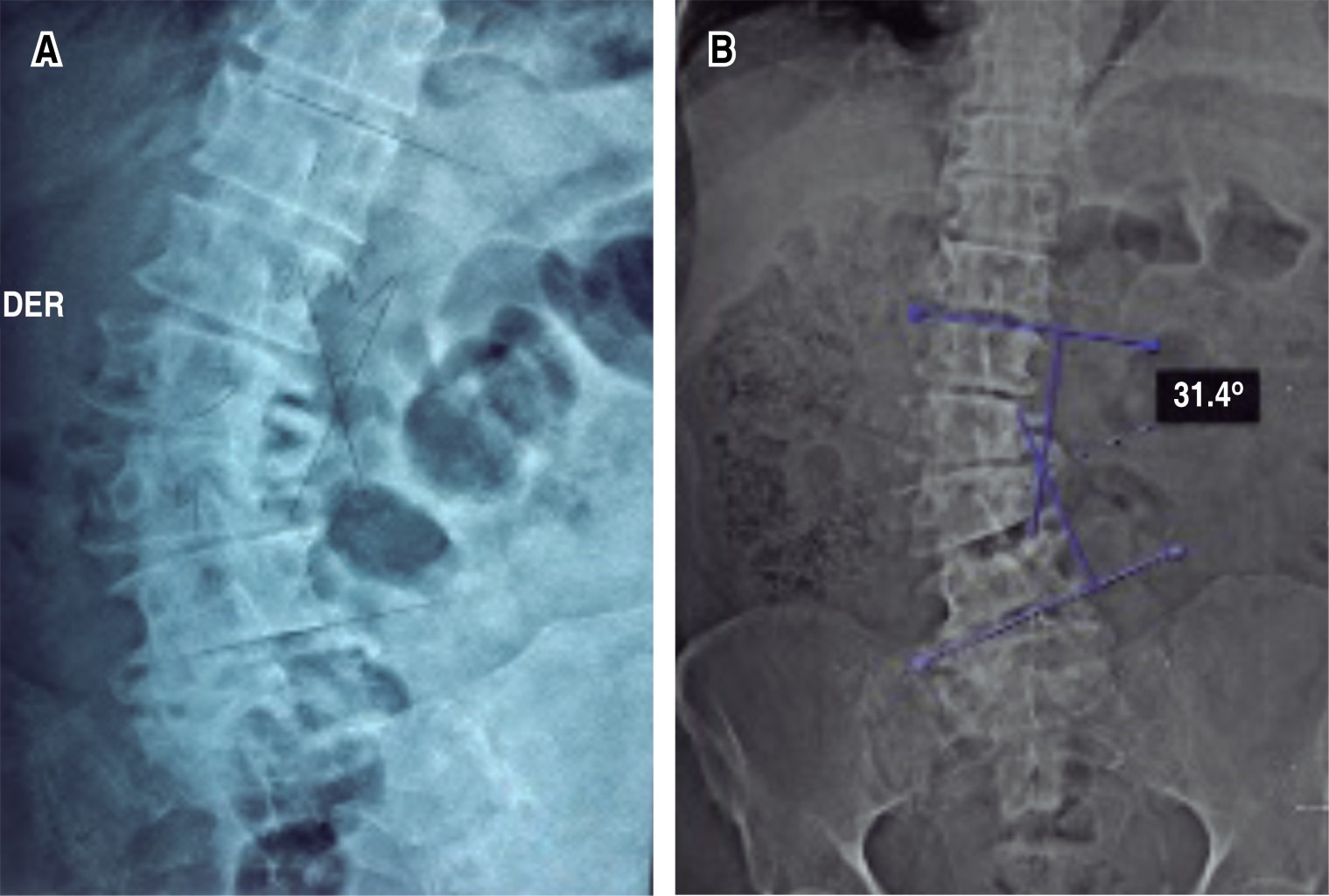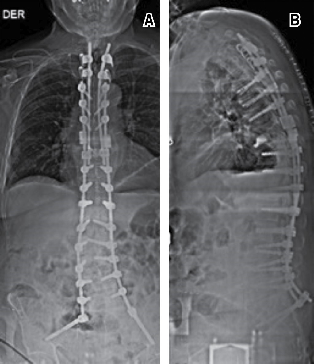 Paciente masculino con escoliosis lumbar degenerativa acompañado de enfermedad de Parkinson (EP). Se instrumenta únicamente los niveles necesarios para corrección de la deformidad coronal, como descompresión de los niveles con estenosis. A pesar de un control radiológico inmediato satisfactorio, en los días posteriores el paciente se aqueja de dolor a nivel de la columna torácica. Rayos X de seguimiento evidencian fractura de la vértebra más cefálica instrumentada. Debido a múltiples comorbilidades, se decide manejo conservador, esperando consolidación del segmento lesionado. Sin embargo, a pesar del tratamiento médico, es llevado cinco meses postoperatorio a sala de operaciones para prolongación de la instrumentación, realizando una transición de una fijación rígida a una semirrígida. El objetivo de la publicación es poner en contexto acerca de la dificultad que conlleva el manejo de un paciente que padezca EP combinado con algún padecimiento degenerativo de la columna.REFERENCIAS (EN ESTE ARTÍCULO)