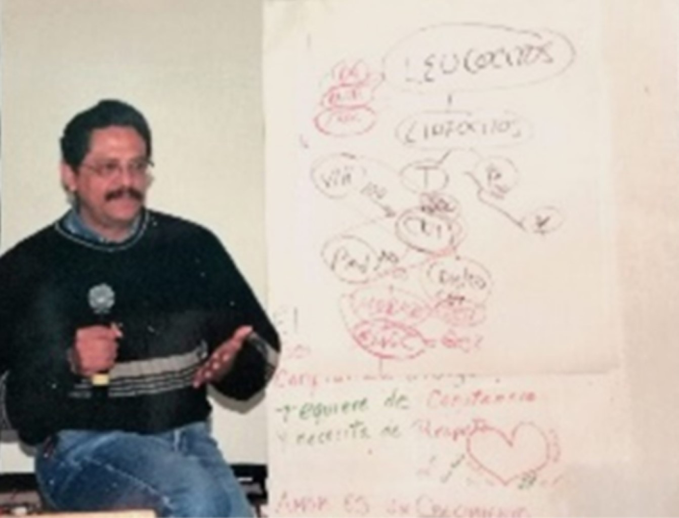Le interesó especialmente el aspecto docente durante toda su vida laboral. Fue profesor de asignatura de Laboratorios de Fisiología Celular y Genética en la Escuela Nacional de Ciencias Biológicas Instituto Politécnico Nacional. Profesor titular asociado y/o invitado o ponente en más de 100 cursos la mayoría de ellos de Medicina Transfusional, pero también de hemofilia, tanatología y VIH-SIDA que fueron algunas de tantas áreas de interés para él. La docencia fue una de sus partes fuertes y que disfrutaba muchísimo, cabe destacar que era muy didáctico y sabía adecuar el lenguaje técnico y científico a cualquier nivel de auditorio (Figura 9). Presentó numerosas conferencias y trabajos en congresos nacionales e internacionales, asesoró tesis y obtuvo diversos reconocimientos por su labor asistencial dentro del IMSS, por parte del INDRE. Por su labor en VIH-SIDA obtuvo reconocimiento por diversas instituciones, entre ellas Ana Francisco AIDS Foundation y CONASIDA.