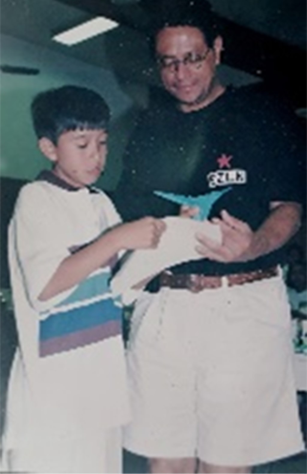 Fue también un padre tierno y amoroso, comprensivo y empático, tuvo 3 hermosas hijas y un varón que fue el menor. Orgulloso de los logros de sus hijos (Figura 15). Recuerdo con particular admiración su ternura, cómo sentaba en su regazo y abrazaba amorosamente a su hijo menor que a la sazón media varios centímetros más que él de altura, como si fuese todavía un pequeñín y cómo ambos disfrutaban de esos momentos (Figura 16).