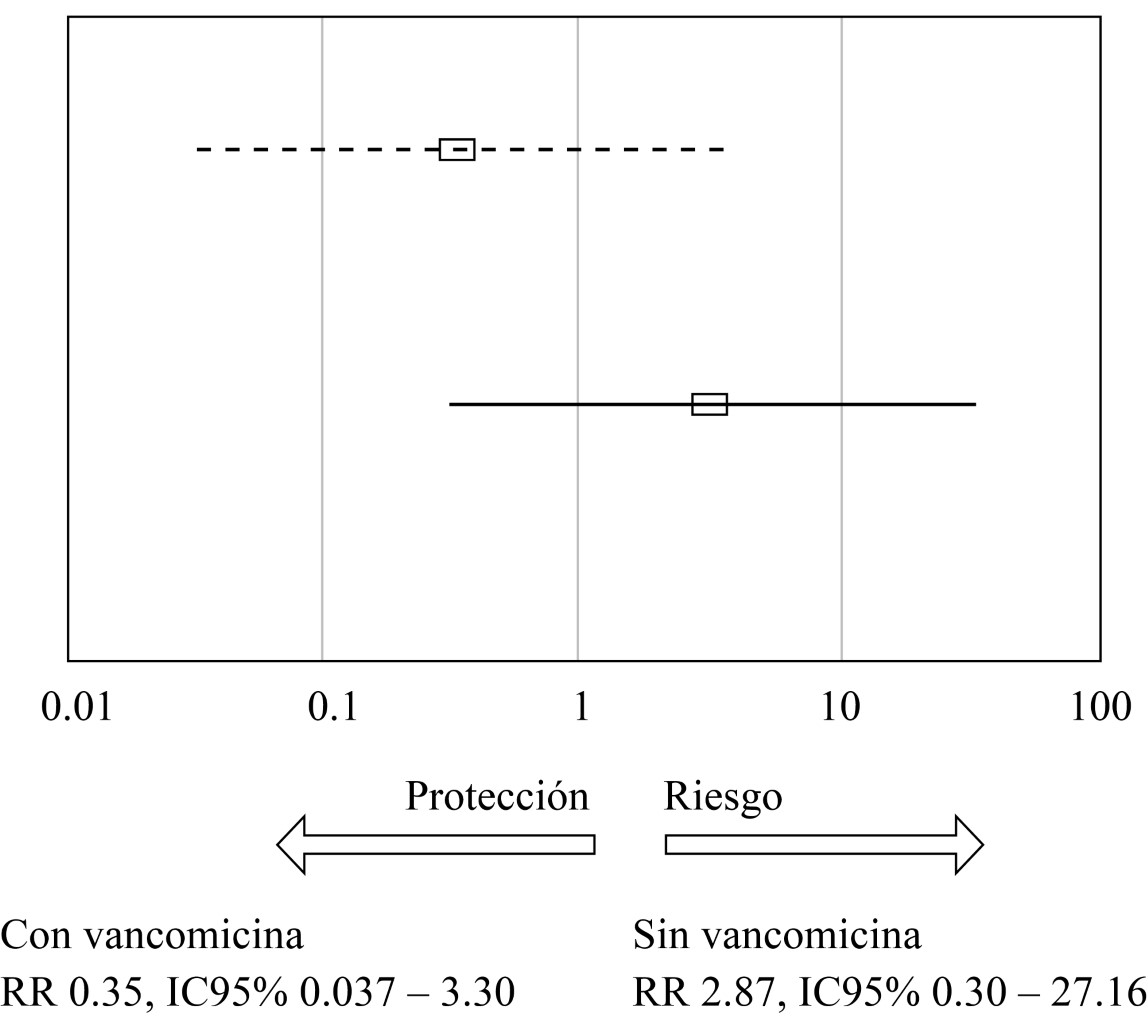 Nuestros resultados muestran que la prevalencia de ISQ en general es muy baja (1.8%) y que es menor en el grupo en que se usa vancomicina que en el grupo en que no se usa (0.09 vs 2.6%) (Tabla 2); de igual forma, el RR de desarrollar ISQ es mayor en el grupo en el que no se usa vancomicina que en el grupo que sí recibió la profilaxis (RR 2.87 [IC95% 0.30 - 27.16] vs RR 0.35 [IC95% 0.037 - 3.30]). Estos resultados, sin embargo, no alcanzan significancia estadística (p = 0.622), como puede observarse en la Figura 1 y concuerdan con el ensayo clínico publicado que precede a este trabajo.16
