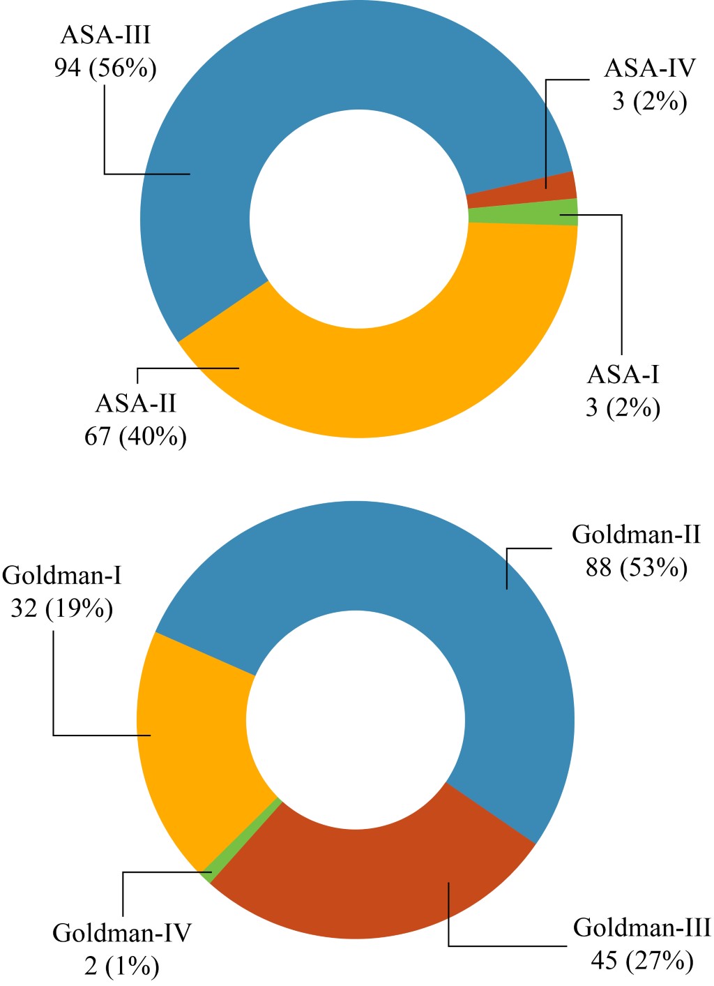 Se evaluó a un total de 178 pacientes con ATC; predominó el sexo femenino (n = 111, 62%). La edad mediana fue de 67.5 años, con mediana de IMC de 28.5 kg/m². Las principales comorbilidades fueron: hipertensión arterial (n = 83, 47%), diabetes mellitus (n = 50, 28%), tabaquismo (n = 35, 20%), alcoholismo (n = 22, 15%), insuficiencia venosa (n = 22, 12%), uso de aspirina (n = 22, 12%) y sangrado previo (n = 20, 11%) (Tabla 2). Los diagnósticos principales de los pacientes sometidos a una ATC primaria fueron: coxartrosis (n = 60, 34%), fractura transcervical AO 31B2.1 (n = 44, 25%) y fractura subcapital AO 31B1.1 (n = 27, 15%). La lateralidad de la intervención estuvo balanceada tanto para el lado izquierdo como para el derecho (51 y 49%, respectivamente). La prótesis más utilizada fue la no cementada (n = 95, 54%), en tanto que la cementada correspondió a 44% (n = 77). En casi todos los pacientes, la anestesia regional fue la más empleada (n = 174, 99%) (Tabla 3). En la evaluación preoperatoria, tuvo mayor frecuencia de pacientes ASA-III (n = 94, 56%) y ASA-II (n = 67, 40%), así como Goldman-II (n = 88, 53%) y Goldman-III (n = 45, 27%, Figura 1).