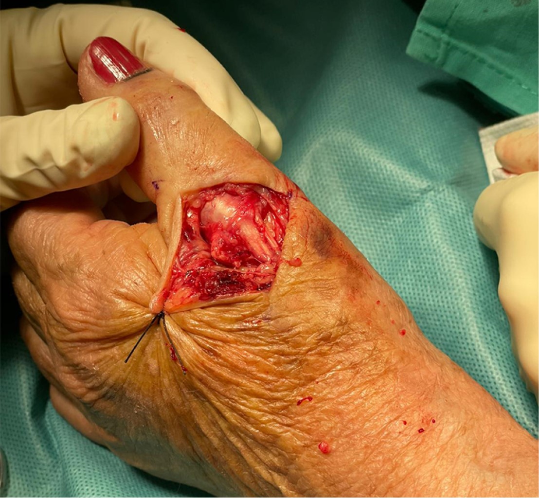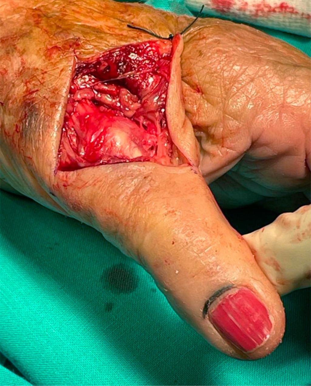 Presentación del caso: presentamos el caso de una mujer de 75 años con luxación metacarpofalángica postraumática del pulgar que requirió reducción abierta y reparación quirúrgica. En este procedimiento realizamos reducción de la luxación, movilización de las estructuras interpuestas, reparación de la cápsula y reinserción del ligamento colateral cubital. El protocolo de movilización temprana ayudó a obtener muy buenos resultados.