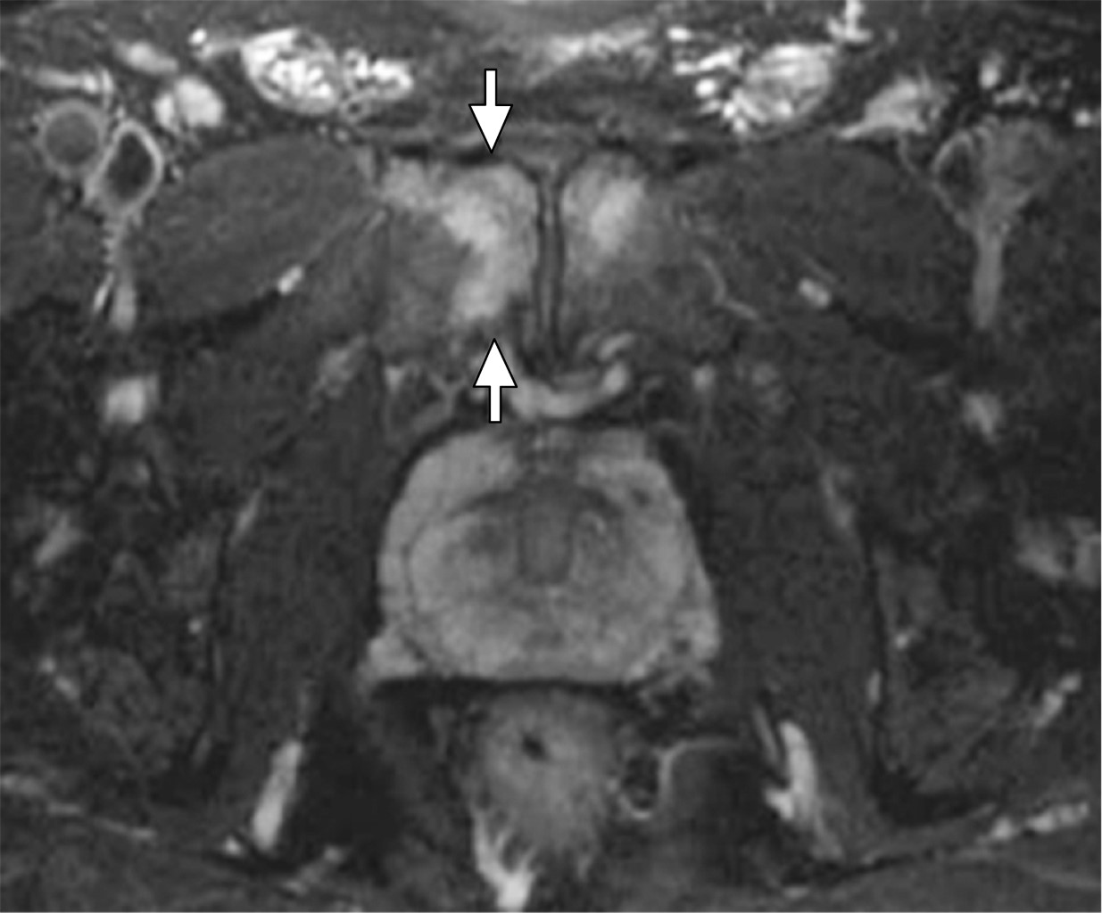Podemos realizar una primera aproximación diagnóstica solicitando una radiografía de pelvis, con proyecciones anteroposteriores y axiales, por su facilidad y coste a la hora de realizarse. Comúnmente, evidenciaremos esclerosis subcondral, irregularidad de la sínfisis y resorción ósea, en casos avanzados (Figura 1).8 La prueba que mayor información nos va a aportar será la resonancia magnética (RM). Será frecuente encontrarse un edema medular difuso, el cual se extiende desde la superficie subcondral, que a menudo involucra ambas ramas púbicas.9 Además, se suelen encontrar signos de periostitis, irregularidades de las superficiales articulares, erosiones, osteofitos anteriores y posteriores y quistes subcondrales. El signo de la herradura está comúnmente presente (Figura 2). Las uniones miotendinosas se conservan, a menos que haya tendinopatía coexistente.9