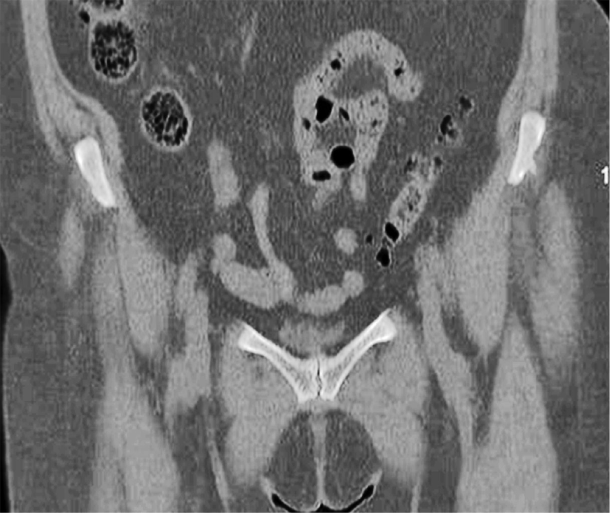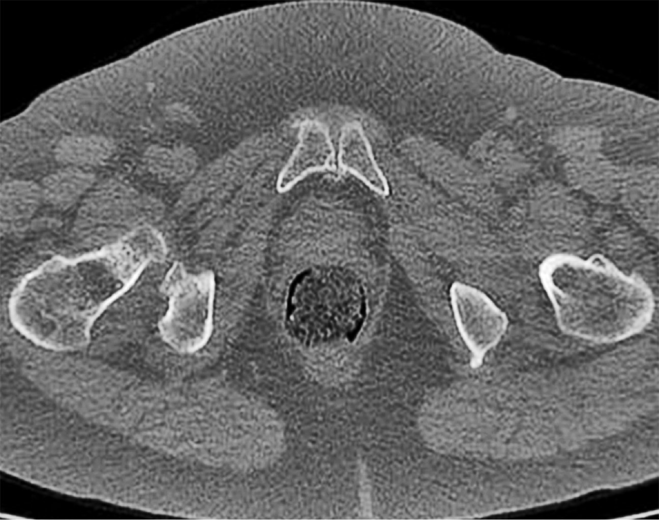 Posteriormente se solicitó una tomografía computarizada (TC) de pelvis en el que se confirmaban los cambios degenerativos (Figuras 4 y 5) y una resonancia magnética que mostraba hallazgos de inflamación en las sínfisis compatibles con osteítis de pubis, asociados a edema de la musculatura adyacente. Ambas pacientes estuvieron realizando sesiones de fisioterapia y toma de antiinflamatorios no esteroideos (AINE) y corticoides con escasa mejoría. La infiltración de bupivacaina junto con corticoide fue el tratamiento más efectivo, pero pasados los dos meses la clínica, se reprodujo y se planteó en ese momento la opción quirúrgica. Las puntuaciones en la escala visual analógica (EVA) previamente a la cirugía fueron de 8 y 9, respectivamente.