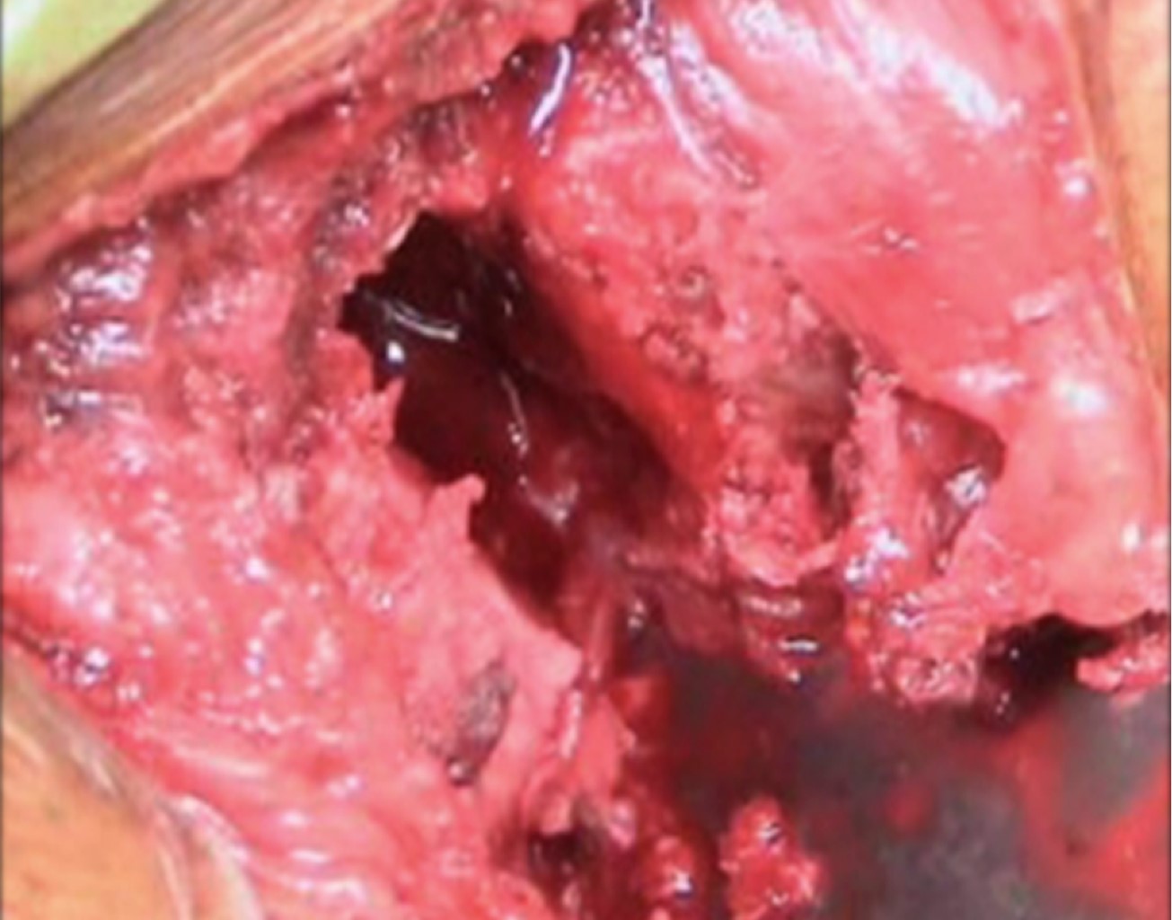 Con la paciente en decúbito supino se realizó una incisión de 12 cm discretamente convexa hacia distal a 3 cm encima de la sínfisis del pubis, tipo Pfannenstiel. Se incidió la fascia de Scarpa y Camper. El aspecto superior de la sínfisis púbica fue expuesto. Se realizó una disección separando y referenciando las inserciones del recto del abdomen desde la línea media para exponer un área suficiente a cada lado de la sínfisis púbica. De esta forma, se logró facilitar la inserción del injerto y la placa de compresión de cuatro orificios. En ambas pacientes se evidenció abundante tejido fibroso, en el lugar del cartílago se encontró tejido de granulación sobre la sínfisis, sugiriendo un proceso inflamatorio crónico y múltiples intentos de reparación. Se resecó el cartílago articular remanente de la sínfisis púbica y se continuó realizando un curetaje sobre la zona de del cuerpo púbico ya denudada sin cartílago (Figura 6). Al mismo tiempo, se realizó la toma de injerto mediante una incisión sobre la espina ilíaca. El tamaño exacto del injerto se determinó en función del tamaño del paciente y la superficie anterosuperior cureteada de la sínfisis. Se colocó el injerto óseo extraído sobre el defecto de la sínfisis y se fijó mediante un cerclaje de alambre (Figura 7). Se utilizó una paca de 3.5 Symphysis Locking Dynamic Compression Plate (SLDCP) (Synthes®, Malans, Switzerland).