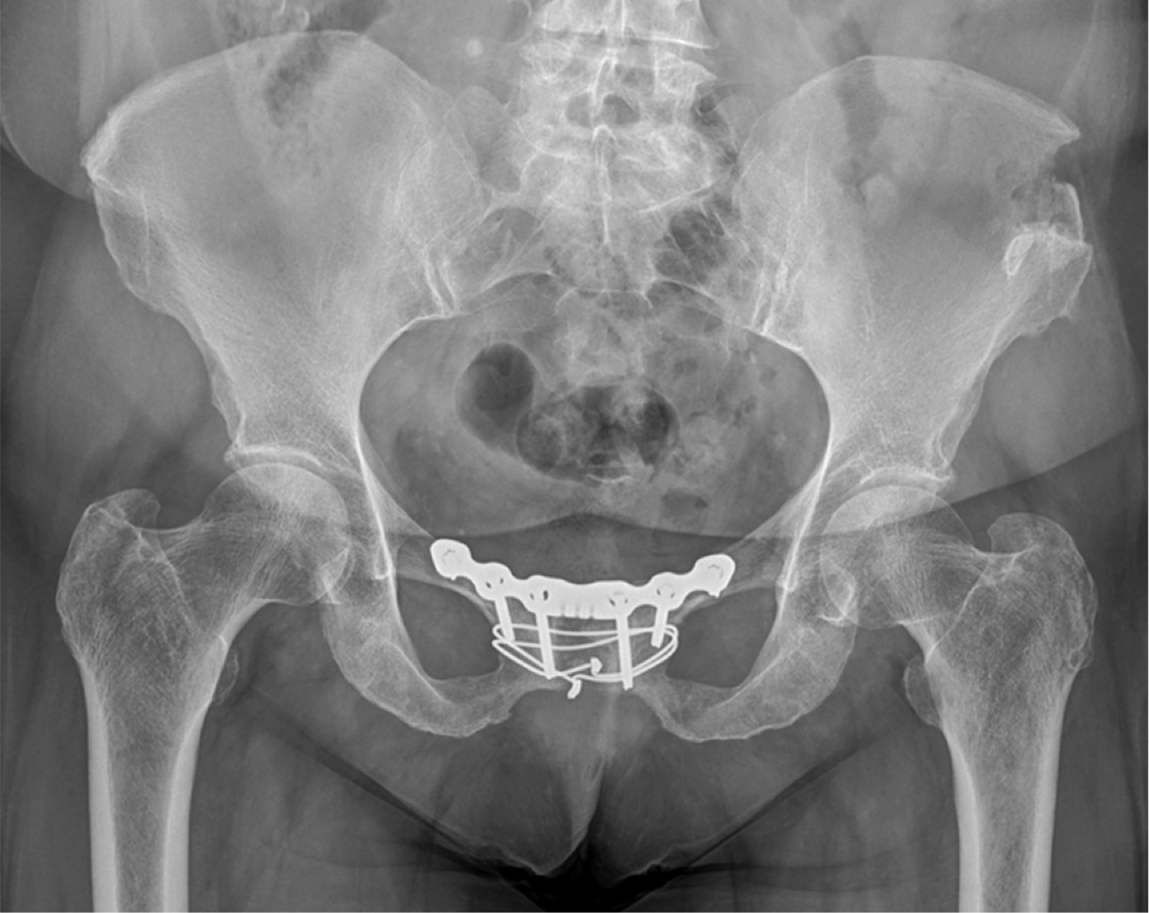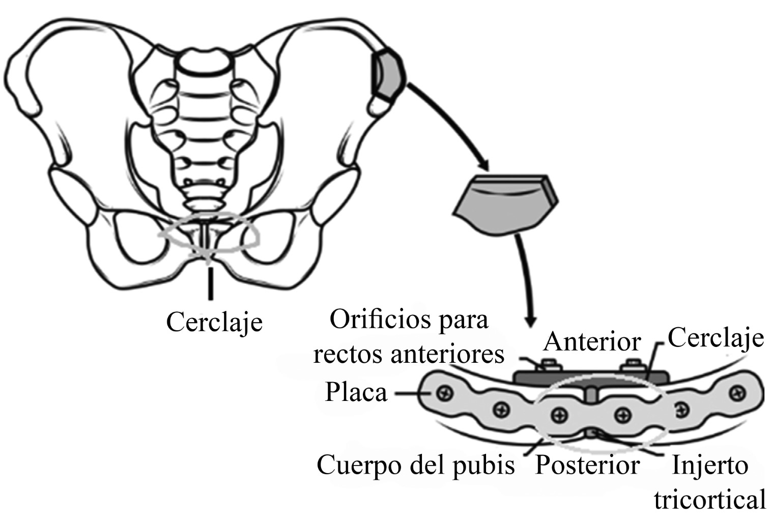 El principio de la artrodesis de la sínfisis del pubis consiste en lograr una mayor estabilidad de la articulación. Aunque es difícil evaluar si el dolor se origina en la articulación sinovial o en los ligamentos circundantes, lo más probable es que la fusión, además de estabilizar la articulación, también logre reducir la tensión en los ligamentos arqueados superior y anterior.13 En nuestra corta serie, la fijación del injerto añadiendo un cerclaje alámbrico creemos que contribuyó en gran medida a evitar la pseudoartrosis y que la fijación fuera eficaz, complicación que han reportado algunos autores.14 En un estudio biomecánico desarrollado por Firtz T y colaboradores, se investigó el impacto de la carga axial en la fuerza de compresión intrasinfisaria durante diferentes posturas. Se comparó la fijación mediante placa SLDCP e injerto óseo rectangular, tal y como se propone en nuestro estudio, en contraste con el bloqueo óseo cilíndrico estabilizado con fijador interno, en fantomas pélvicos. Observaron que, en posición bípeda, la fuerza de compresión disminuyó en ambos grupos; mientras que, tras la carga, el grupo con cilindro mostró pérdida significativa del contacto. Sin embargo, en posición unipodal, la placa SLDCP exhibió un área de contacto mayor con injerto de cilindro, concluyendo que ésta última suponía una opción a tener en cuenta.15