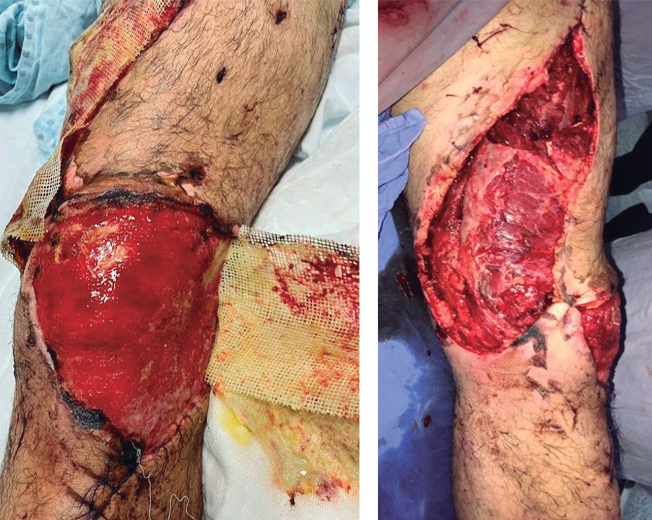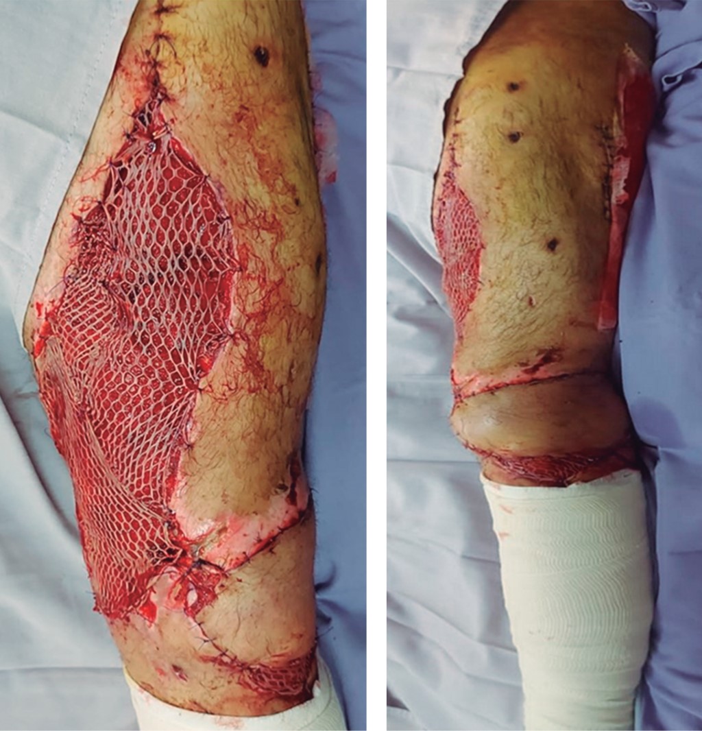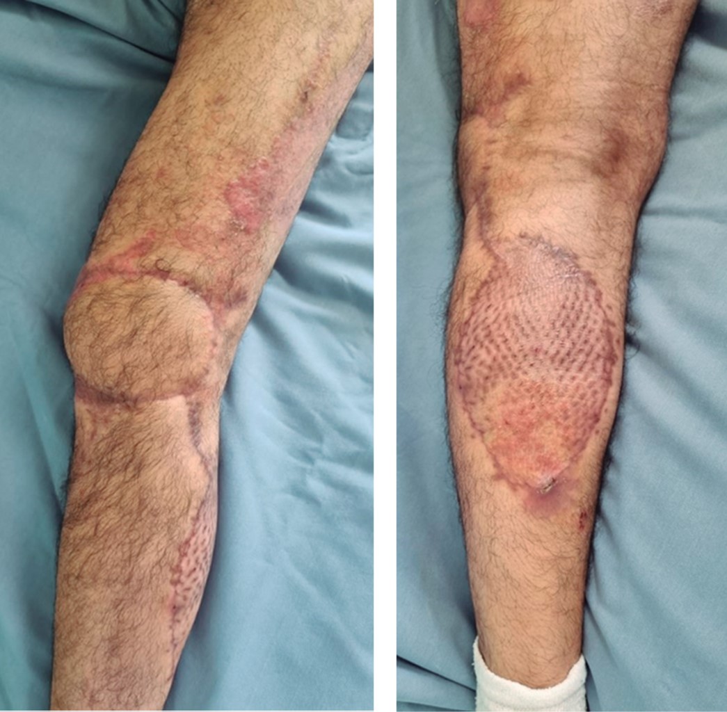 Hombre de 36 años que sufrió accidente automovilístico, presentaba área cruenta en rodilla y muslo izquierdos. Se realizó aseo quirúrgico y desbridamiento del área cruenta en rodilla izquierda, de 18 cm de largo y 9 cm de ancho. Técnica quirúrgica: para el procedimiento se posicionó al paciente en decúbito prono, con marcaje quirúrgico de isla cutánea de 18 cm de largo por 9 cm de ancho (Figura 8). En este caso se utilizó la misma técnica quirúrgica que en el caso 1 para la elevación del colgajo. Se identificó el nervio sural medial y la vena safena menor, posteriormente se efectuó el levantamiento del colgajo (Figura 9). La diferencia con el caso 1 fue la cobertura de la zona donadora por medio de colocación de injerto cutáneo de espesor parcial tipo Blair-Brown 0.018 pulgadas, con dermatomo Zimmer, en malla (Figuras 10 y 11), con el objetivo de dar cierre a la zona donadora del colgajo y área cruenta de muslo izquierdo, se siguió la metodología propuesta por Arafa y Youssef.7 El evento quirúrgico finalizó tras dos horas con treinta minutos, con estancia hospitalaria de dos días. En el control postoperatorio a tres y seis meses no se presentaron complicaciones (Figura 12).