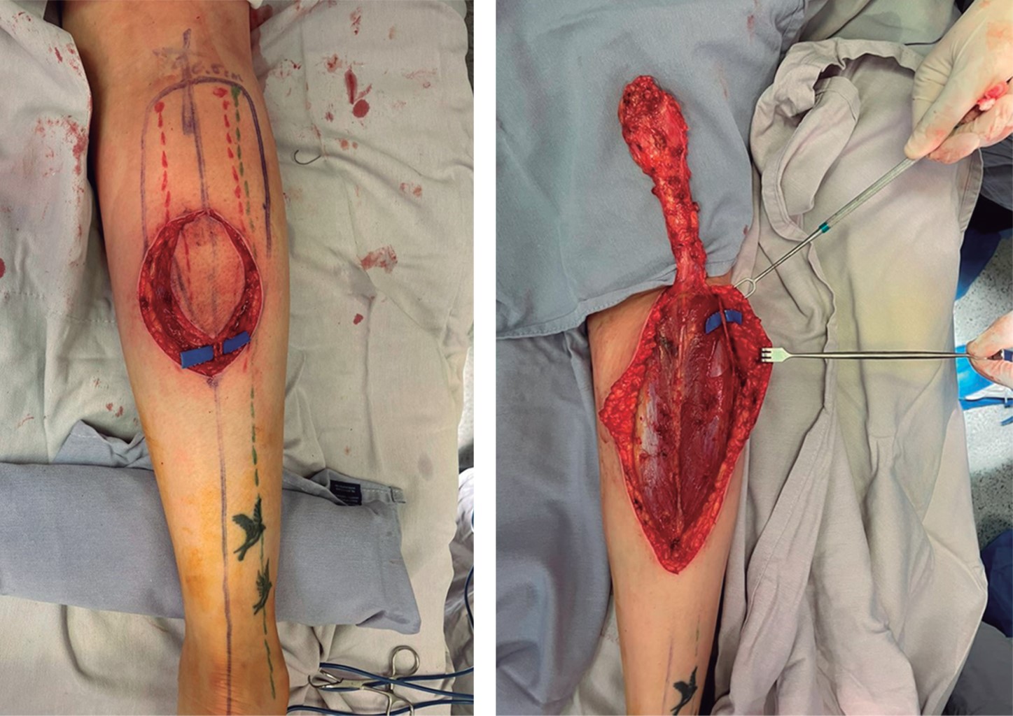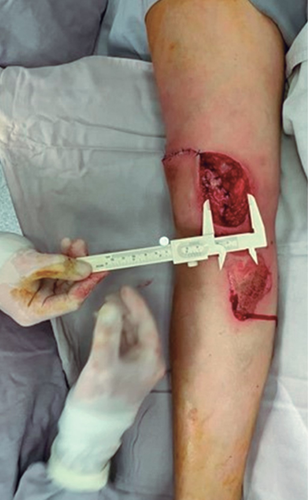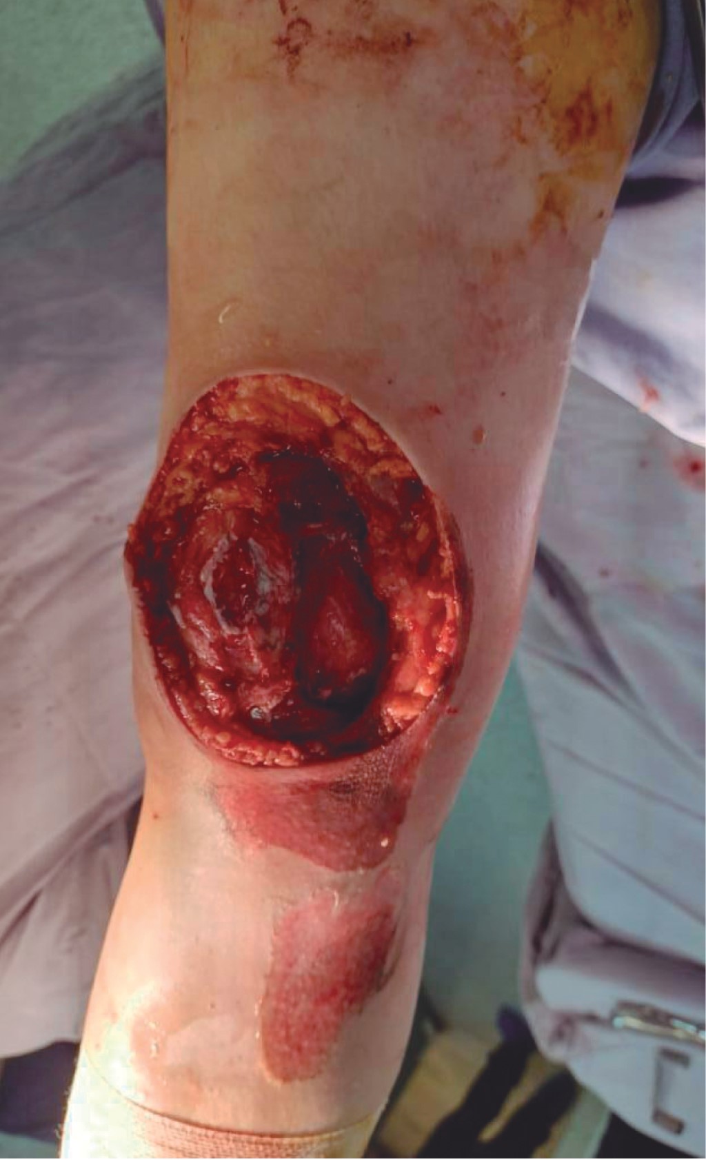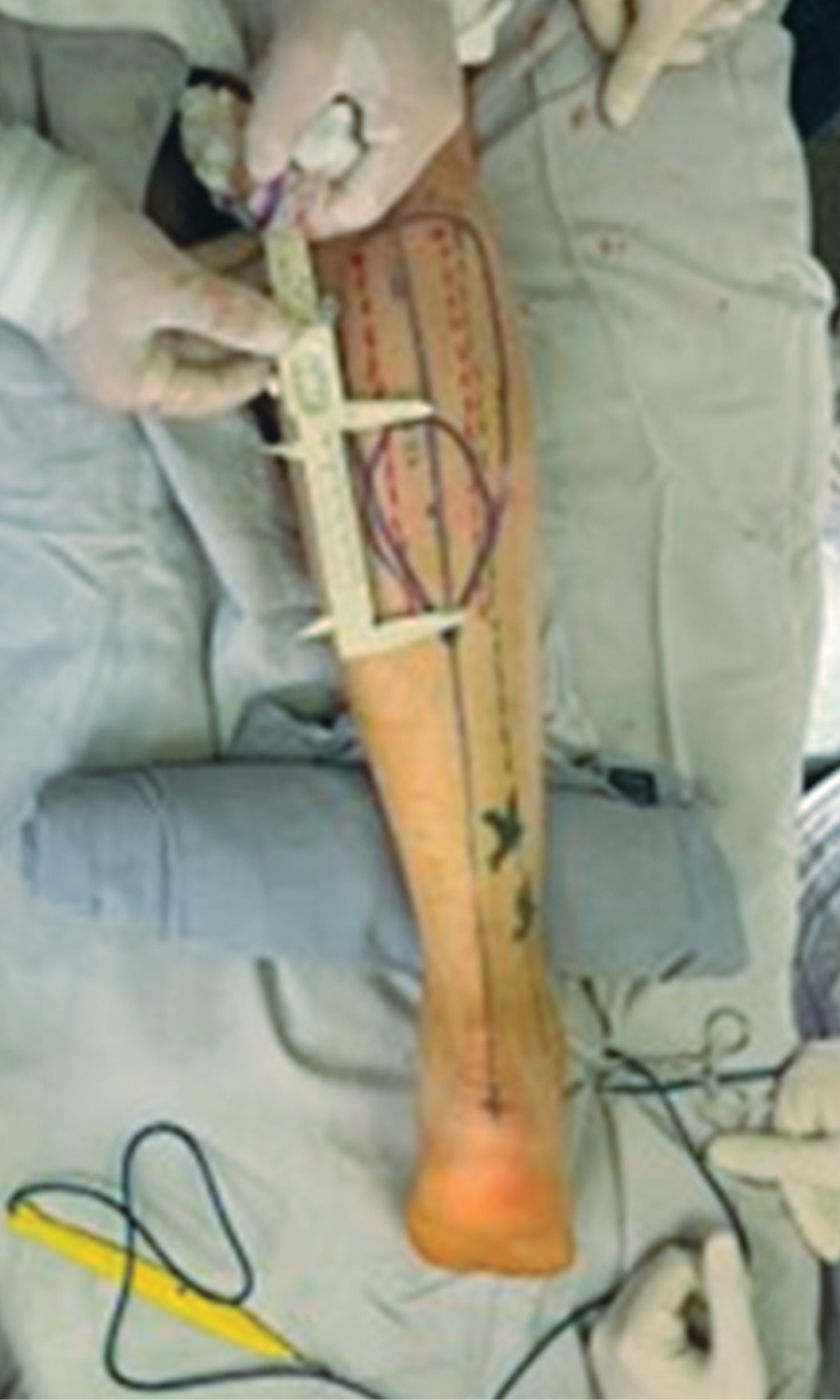 Mujer de 26 años que sufrió accidente automovilístico con área cruenta resultante de 10 cm de largo por 10 cm de ancho de forma circular, con exposición ósea del cóndilo medial del fémur derecho (Figura 2). Se realizó aseo mecánico y desbridamiento de rodilla, se hizo cierre primario de los bordes de la herida, como resultante quedó un defecto de espesor total de 3 cm de ancho por 6 cm de largo (Figura 3). Se utilizó un colgajo sural de base proximal como opción reconstructiva para cubrir el defecto, con un marcaje quirúrgico específico (Figura 4), se usaron como referencias anatómicas el marcado de una línea media posterior, se comenzó en la fosa poplítea hacia la porción media del hueso calcáneo, centrado sobre el rafe de las cabezas medial y lateral del gastrocnemio. Las dimensiones fueron de 6 cm de largo por 3 cm de ancho.