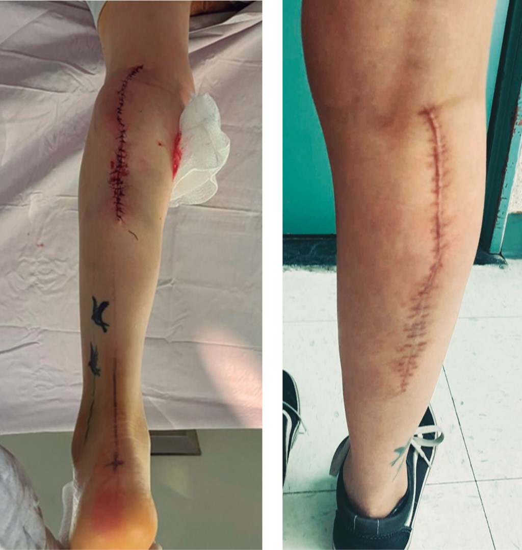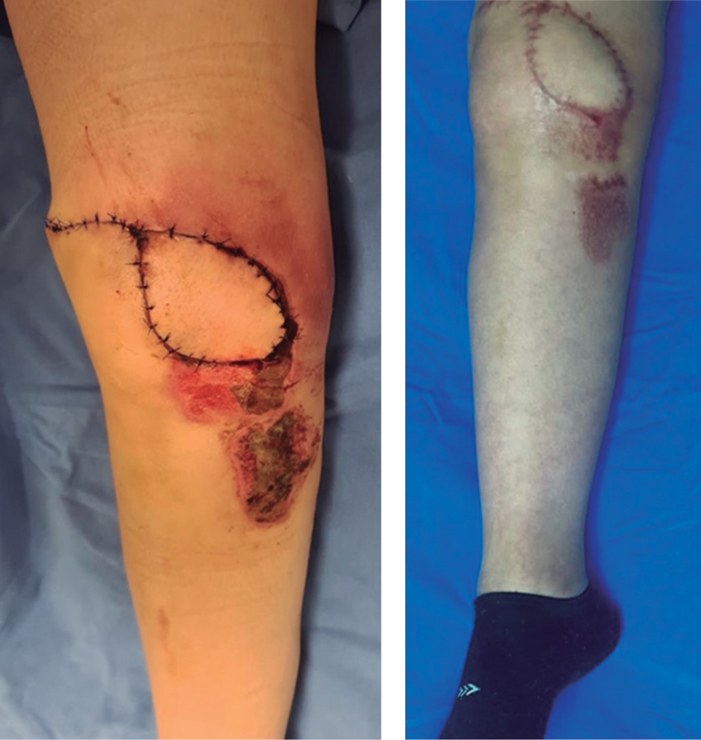 Técnica quirúrgica: se colocó al paciente en decúbito prono, se hizo antisepsia con yodopovidona, se procedió a la disección sin isquemia, con incisión de bordes lateral y medial del colgajo, piel, tejido celular subcutáneo, fascia superficial y profunda. La elevación del colgajo inició en la porción distal, localizando la vena safena menor y el nervio cutáneo sural lateral. Se ligaron y cortaron ambas estructuras y se incluyeron en el colgajo, seguido de la elevación hacia la fosa poplítea en un plano de disección subfascial, incluyendo el septo del rafe intermuscular gastrocnemio medial y lateral. Una vez alcanzado el tercio proximal de la pierna y siguiendo el procedimiento implementado por Masquelet, Romana y Wolf,4 se visualizó el lugar donde perfora la fascia profunda la arteria sural media y lateral, se continuó la disección hasta llegar a su punto pivote localizado a nivel de la fosa poplítea, en donde el arco de rotación alcanza el defecto de manera aceptable (Figura 5). Una vez levantado el colgajo, se procedió a tunelizarlo hacia el defecto de la rodilla o incidir el puente cutáneo para la colocación del colgajo en la zona receptora (Figura 6). Por último, para el cierre de la zona donadora, se realizó cierre primario. El evento quirúrgico finalizó tras dos horas con treinta minutos, con una estancia hospitalaria de dos días. En el control postoperatorio a tres y seis meses no se presentaron complicaciones (Figura 7).