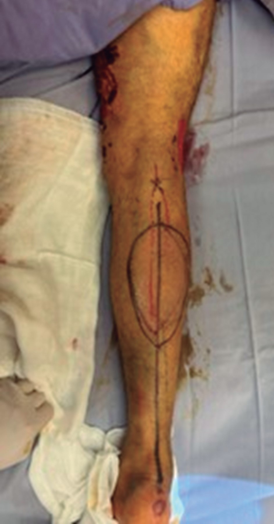 Los defectos de los tejidos blandos alrededor de la rodilla pueden tratarse con una variedad de métodos reconstructivos, como el colgajo de músculo gastrocnemio, sin embargo, éste puede dar resultados estéticos y funcionales insatisfactorios.1 Los defectos de los tejidos blandos que se producen a menudo en esta región son difíciles de cubrir, debido a la poca extensibilidad de la piel, tiene un riego arterial deficiente y el retorno venoso superficial en esta área se vuelve ineficaz.2 Las características de este colgajo, por composición, es un fasciocutáneo, con un patrón de circulación de acuerdo con Mathes y Nahai de tipo A, y con Cormack y Lamberti de tipo B. Cuenta con inervación sensitiva dada por el nervio cutáneo sural medial (S1-S2), rama del nervio tibial, cuyas medidas son de 10 a 30 cm de largo y 6 a 12 cm de ancho. Su pedículo dominante es la arteria cutánea directa (largo: 3 cm, diámetro: 1.4 mm), rama de la arteria sural. El drenaje está dado en su mayoría por su vena dominante: la safena menor.3,4 Ambas, vena y arteria previamente mencionadas, son ramas de la arteria poplítea y vena concomitante. Cuenta con un pedículo menor que es la arteria perforante musculocutánea (largo: 1 cm, diámetro: 0.4 mm). Su drenaje secundario son las venas comitantes a ésta. El territorio de la isla cutánea está localizado entre la fosa poplítea y el tercio medio posterior de la pierna.3,4 Por lo anterior, las indicaciones son para la cobertura de rodilla, fosa poplítea y tercio superior de la pierna.4 Diversos autores han descrito su efectividad y utilidad, no obstante, de su uso existen pocos informes clínicos publicados.5,6 La Figura 1 muestra este tipo de colgajo y su marcaje.