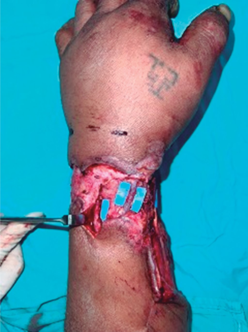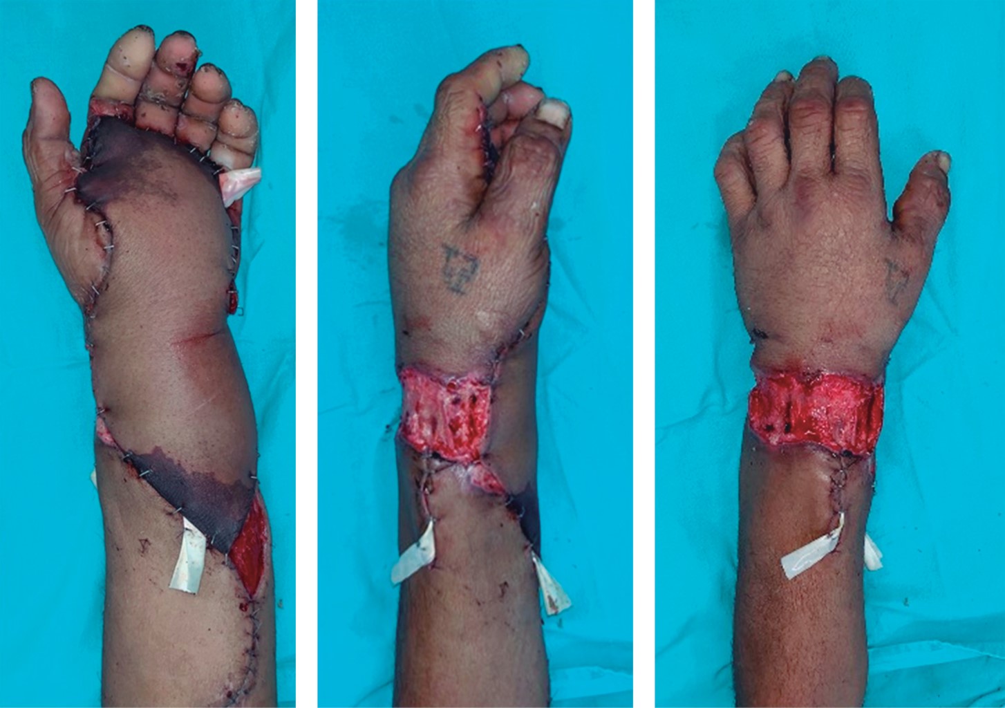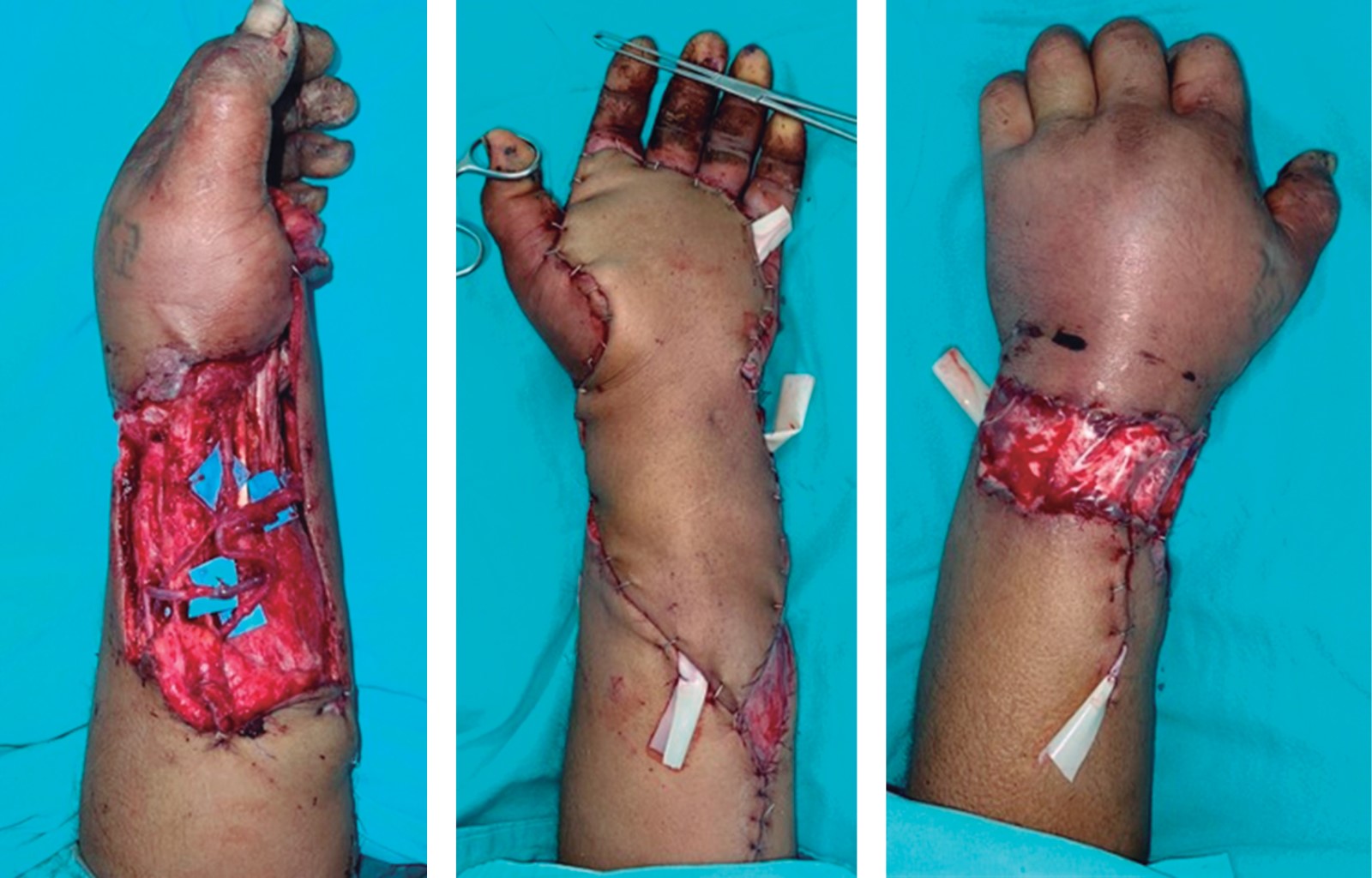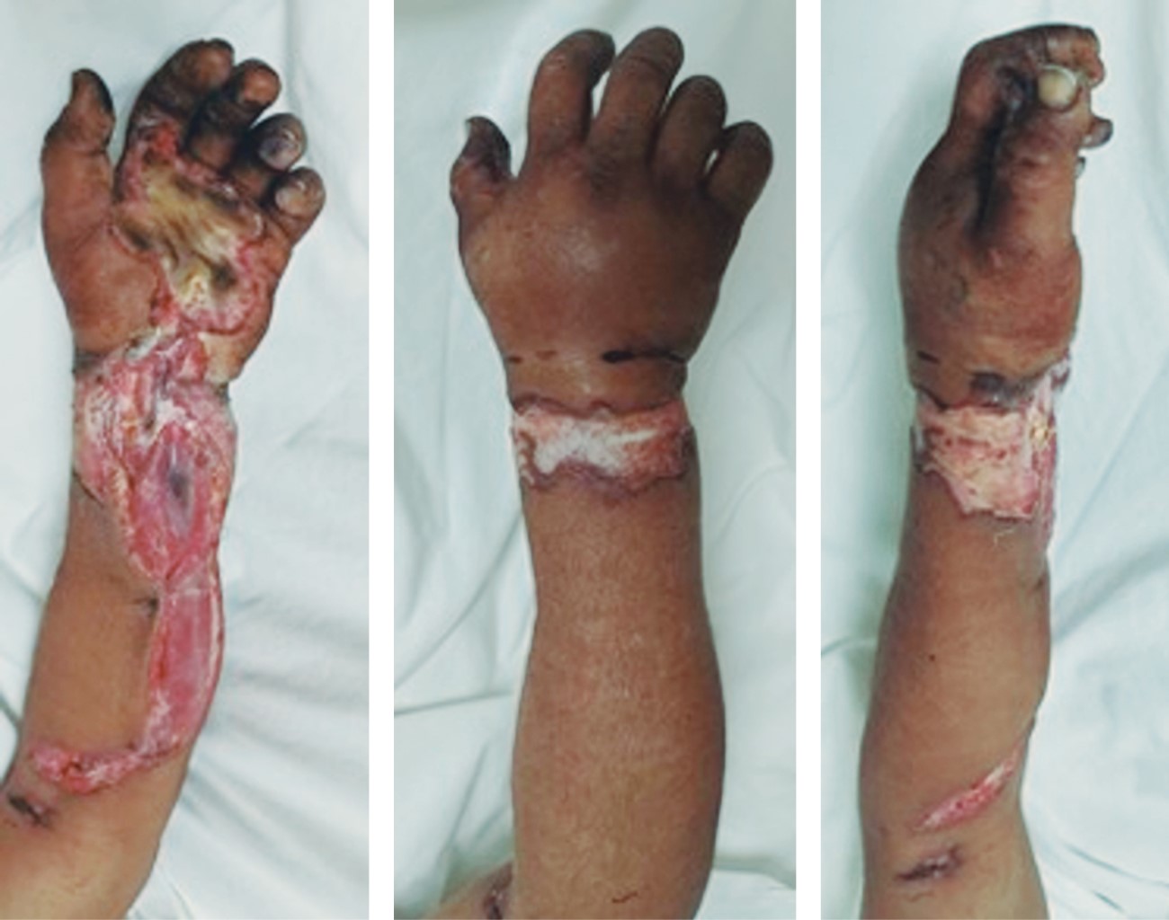 Hombre de 37 años, sin antecedentes de importancia, quien estaba hospitalizado en cirugía plástica y reconstructiva por quemadura eléctrica de alta tensión; postoperado de fasciotomía de miembro superior izquierdo indicada por síndrome compartimental. A la exploración física se observó herida cruenta localizada en mano y antebrazo izquierdos, en las zonas flexoras II, III, TIII, IV y V, así como zona extensora VIII, con bordes irregulares (Figura 1).