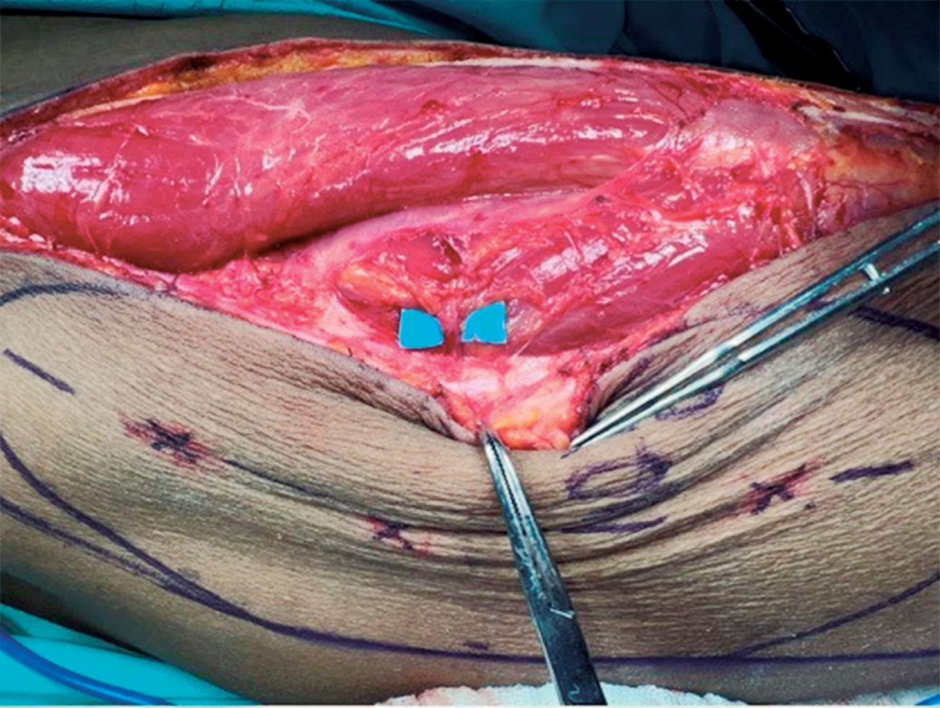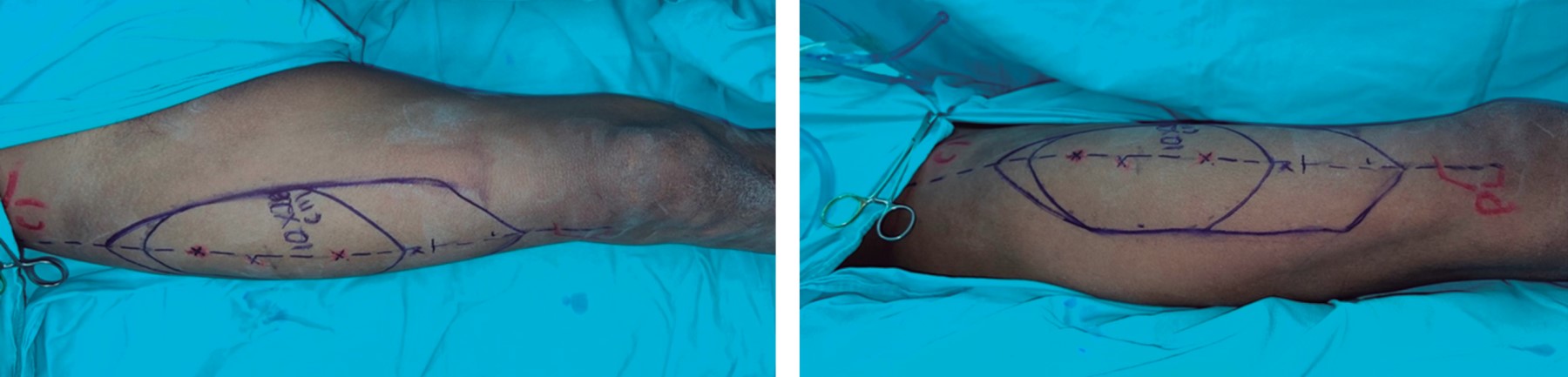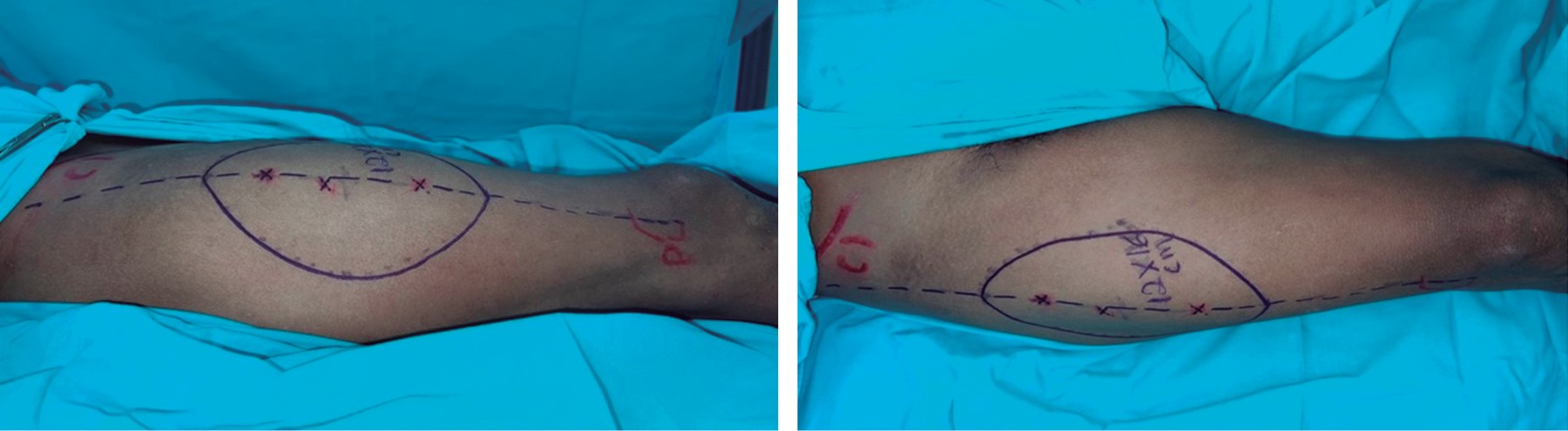 Se inició protocolo prequirúrgico para realizar desbridamiento, irrigación y lavado de la zona cruenta para realizar colgajo libre anterolateral del muslo para cobertura de la herida. Se comenzó la planificación preoperatoria con marcaje del colgajo, se colocó al paciente en decúbito supino y se dibujó una línea recta desde la espina iliaca anterosuperior hasta el borde superolateral de la rótula; ésta corresponde al septo entre el músculo recto femoral y el músculo vasto lateral. Se calculó y señaló el punto medio de dicha recta, trazando una circunferencia de 12 × 16 cm. En esta área se realizó el mapeo de los vasos perforantes por medio de eco Doppler para identificar la perforante dominante (Figura 2). Finalmente, se diseñó el colgajo con dimensiones de 10 × 28 cm (Figura 3).