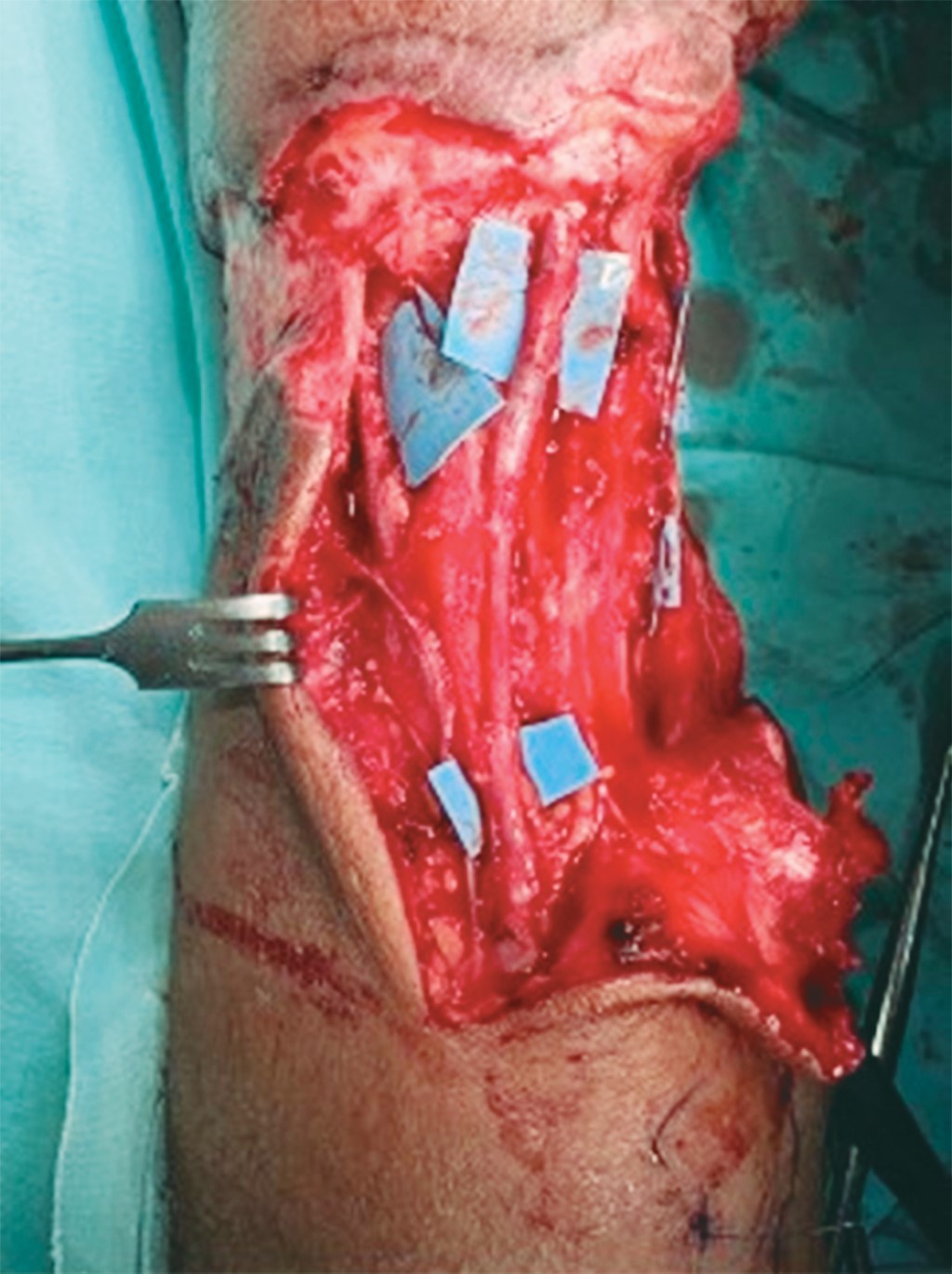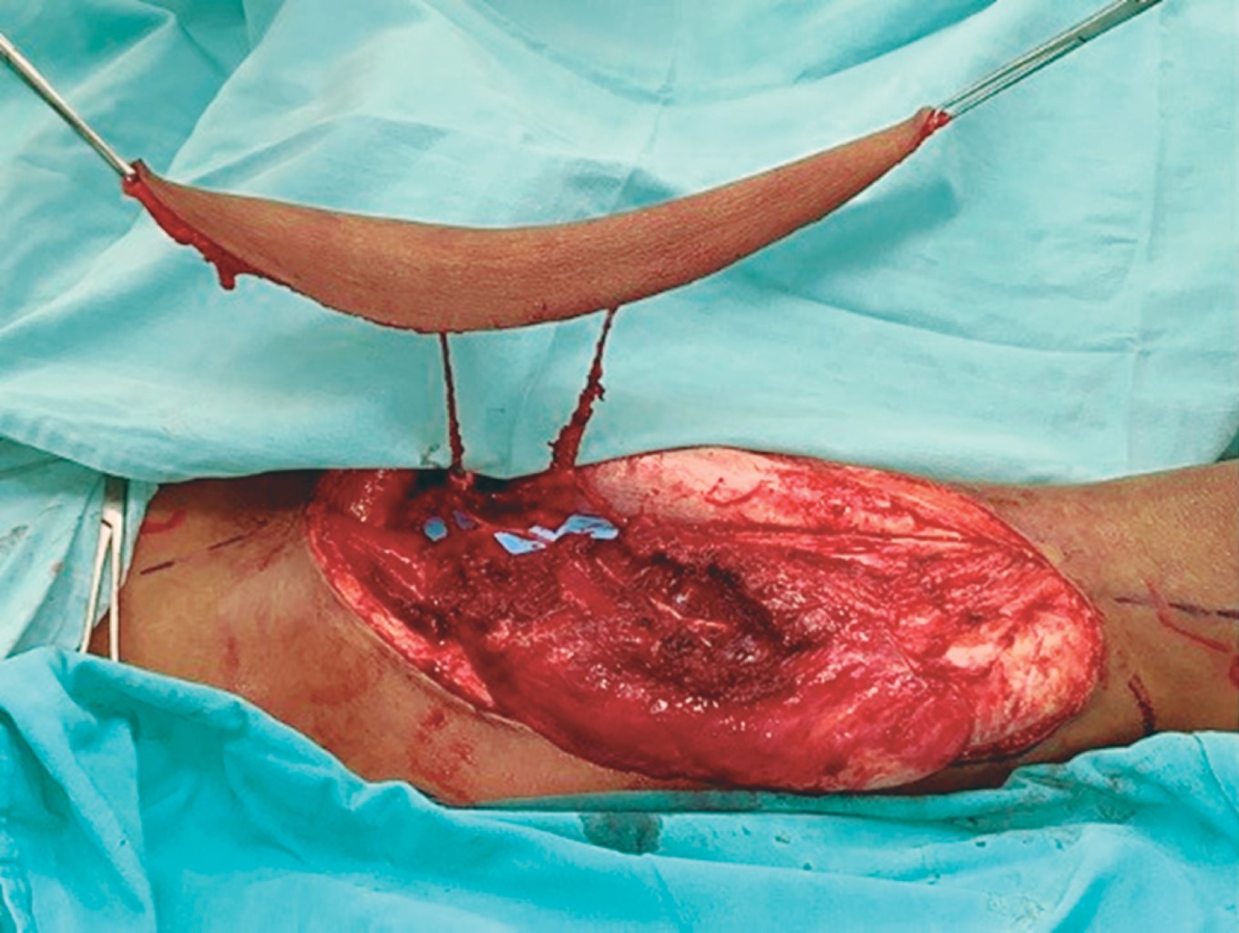 Después, se realizó el desbridamiento, irrigación y lavado del área receptora para estar lista para el colgajo, se identificó arteria y vena radial (Figura 4), las cuales se utilizarían posteriormente para anastomosar el lecho vascular del colgajo (Figura 5).