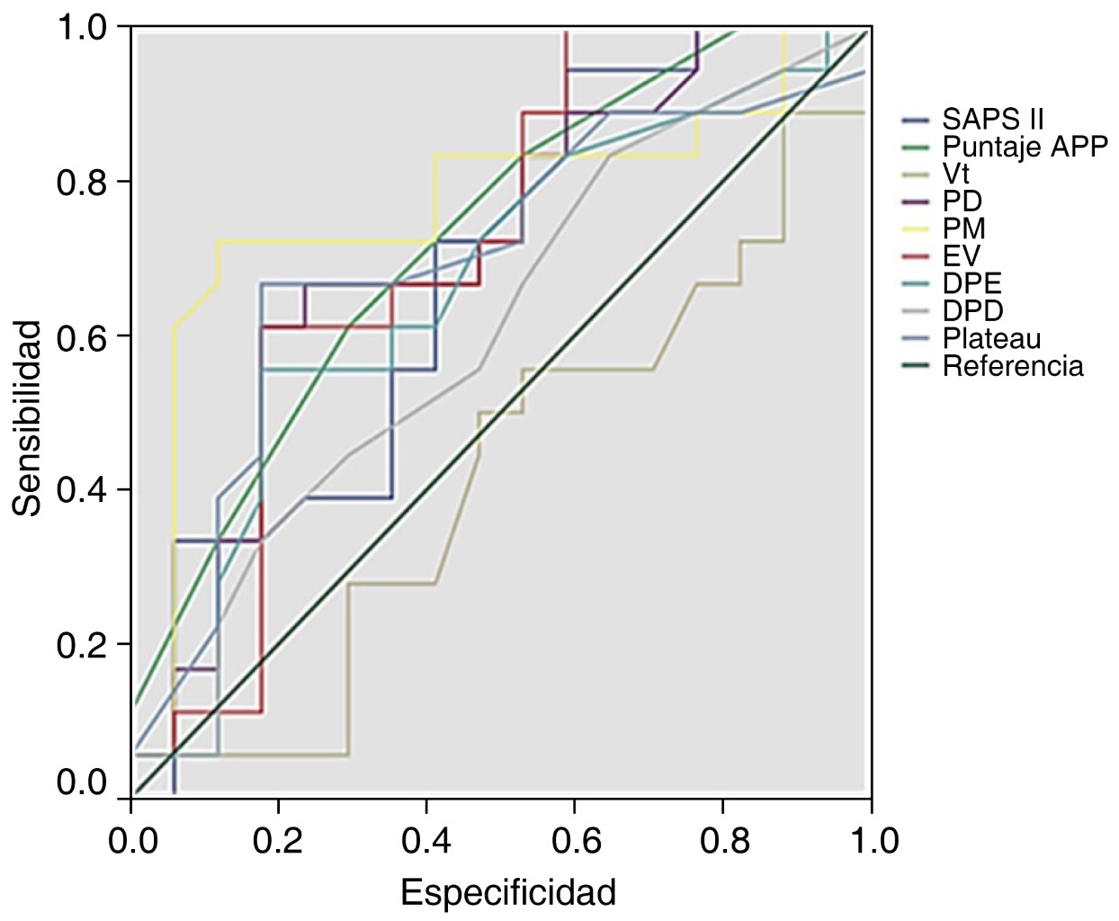 En la Figura 1 observamos la curva ROC para el AUC de SAPS II (AUC 0.675), puntaje APP (AUC 0.72), Vt (AUC 0.420), DPD (AUC 0.66), DPE (AUC 0.60), PM (AUC 0.77), PD (AUC 0.71), EV (AUC 0.70) y plateau (AUC 0.69).