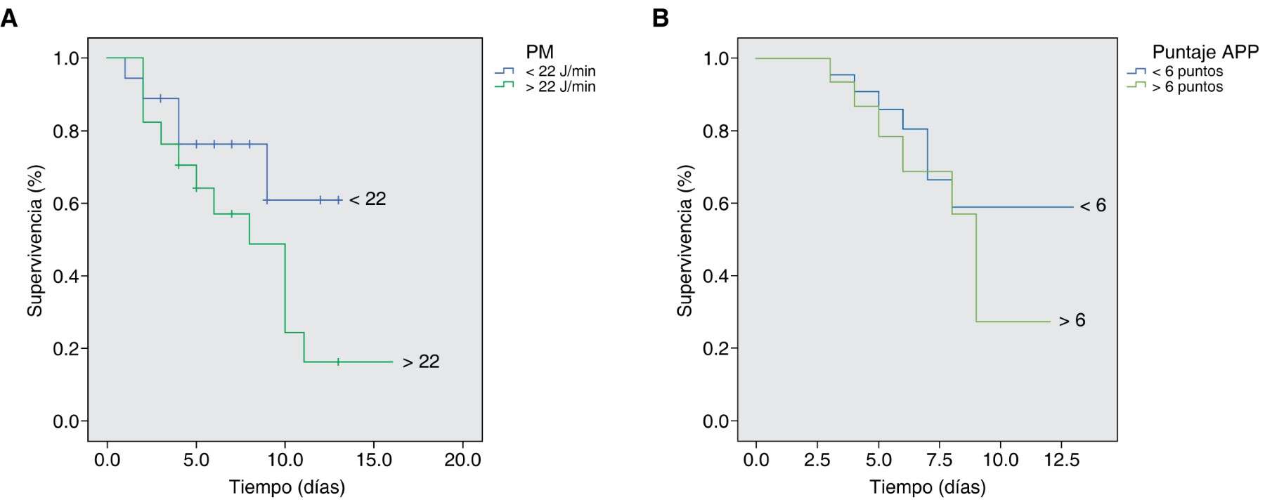 Se realizó un modelo de regresión logística de Cox para supervivencia de las variables con mejor AUC que incluyó el PM > 22 J/min con p = 0.02 (Figura 2A) y para APP > 6 puntos con p = 0.03 (Figura 2B).