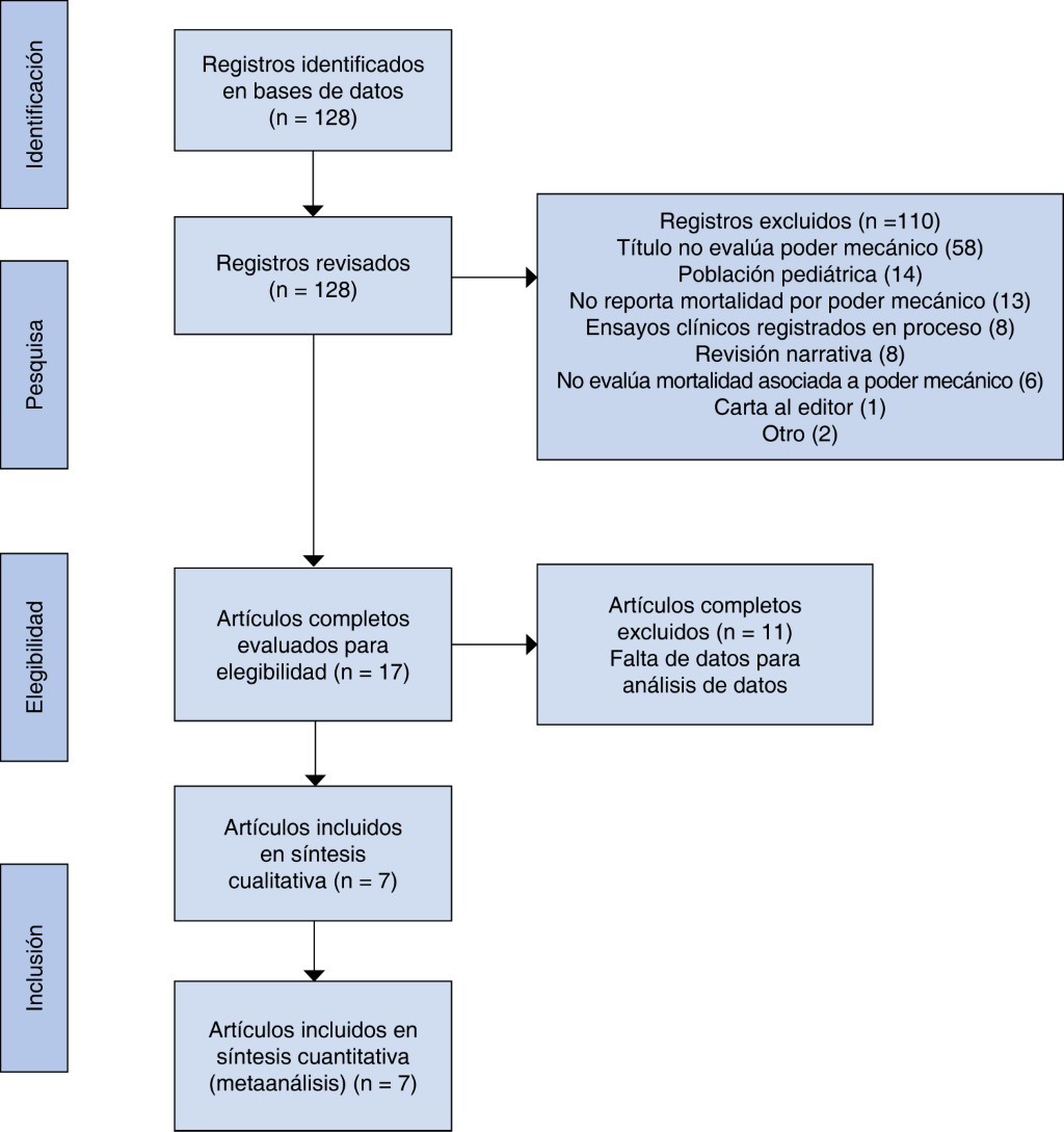 Este estudio fue elaborado siguiendo las guías para el desarrollo de revisiones sistemáticas y metaanálisis PRISMA 2020 (Preferred Reporting Items for Systematic reviews and Meta-Analysis).13 Se incluyeron ensayos controlados aleatorizados, estudios controlados, estudios de cohorte y estudios de casos y controles en los que se investigó el poder mecánico en ventilación mecánica. No existió restricción de idiomas en la búsqueda. Se excluyeron editoriales, revisiones narrativas, informes de conferencias, resúmenes, series y reportes de caso. Tipo de participantes: adultos (edad ≥ 18 años) que recibieron VMI en unidades de terapia intensiva. Tipo de intervenciones: se incluyeron estudios que compararon diferentes valores de poder mecánico y que reportaron la asociación con la supervivencia. Tipo de medidas de desenlaces: supervivencia.