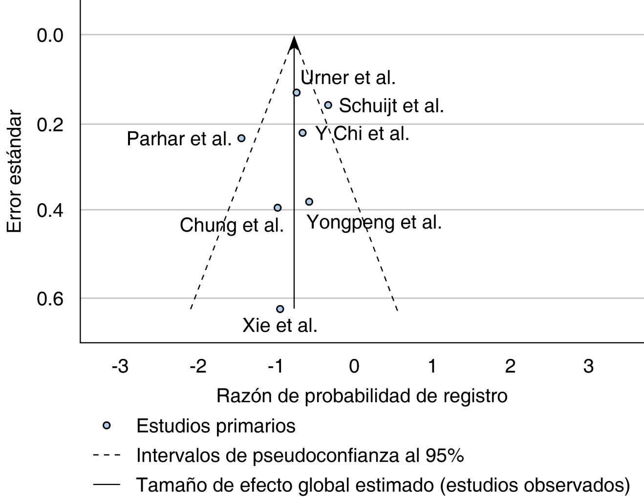 Se realizó una búsqueda electrónica que recuperó un total de 128 publicaciones (Figura 1). Después de una lectura del texto completo, identificamos 17 publicaciones elegibles, de los cuales, 11 fueron excluidos debido a que no cumplieron con los criterios de inclusión. Finalmente, incluimos siete estudios en esta revisión.14-20 Se incluyeron seis estudios observacionales y un análisis secundario de ensayos controlados aleatorizados (n = 3,775). El número de participantes incluidos en cada estudio varió de 52 a 1,589 (Tabla 1). Seis estudios involucraron pacientes con diagnóstico de síndrome de insuficiencia respiratoria aguda (SIRA), y uno incluyó pacientes con falla respiratoria aguda (SIRA y no SIRA). Los estudios elegidos mostraron distintos valores de corte para el poder mecánico y su asociación con la supervivencia. Cinco estudios presentaron bajo riesgo de sesgo de acuerdo con la escala Newcastle-Ottawa, que les confiere buena calidad, y dos estudios tuvieron calidad suficiente (Tabla 1). Una inspección visual del gráfico de embudo no reveló sesgo de publicación; sin embargo, los estudios de mayor peso se encuentran con simetría dentro del gráfico (Figura 2).